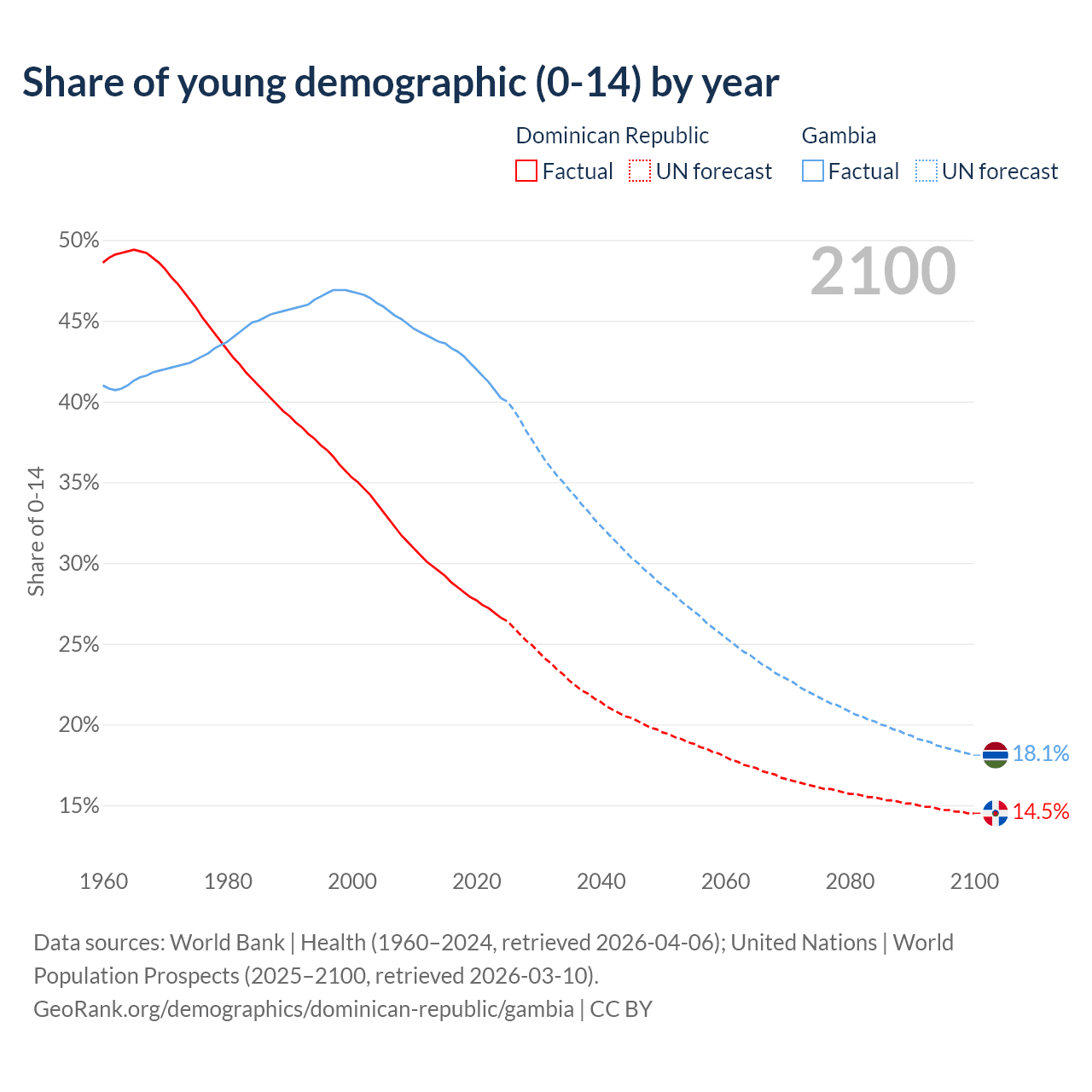 - The share of young demographic (0-15 years old) in the Dominican Republic is 26.6% vs 40.2% in the Gambia.