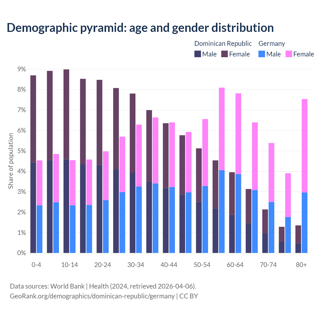 - As of 2026, the population of the Dominican Republic is 11.6M vs 82.6M in Germany - 7.1 times difference.
