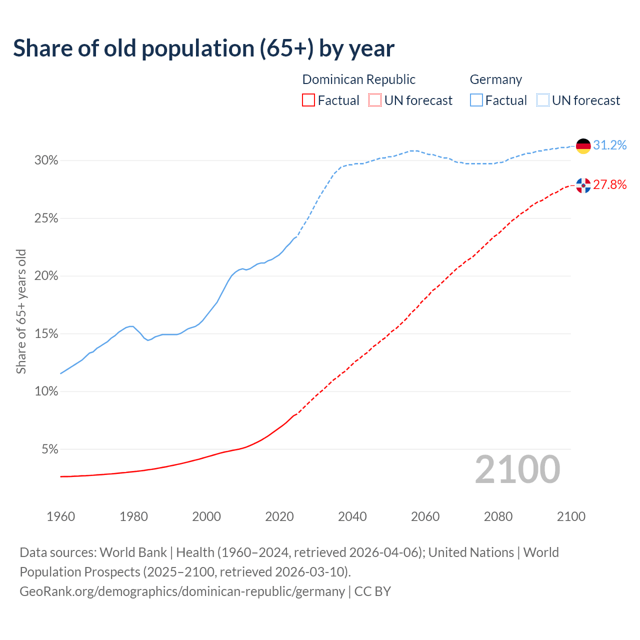 The share of older people aged 65 and over is 7.88% in the Dominican Republic and 23.2% in Germany. Life expectancy in the Dominican Republic compared to Germany .