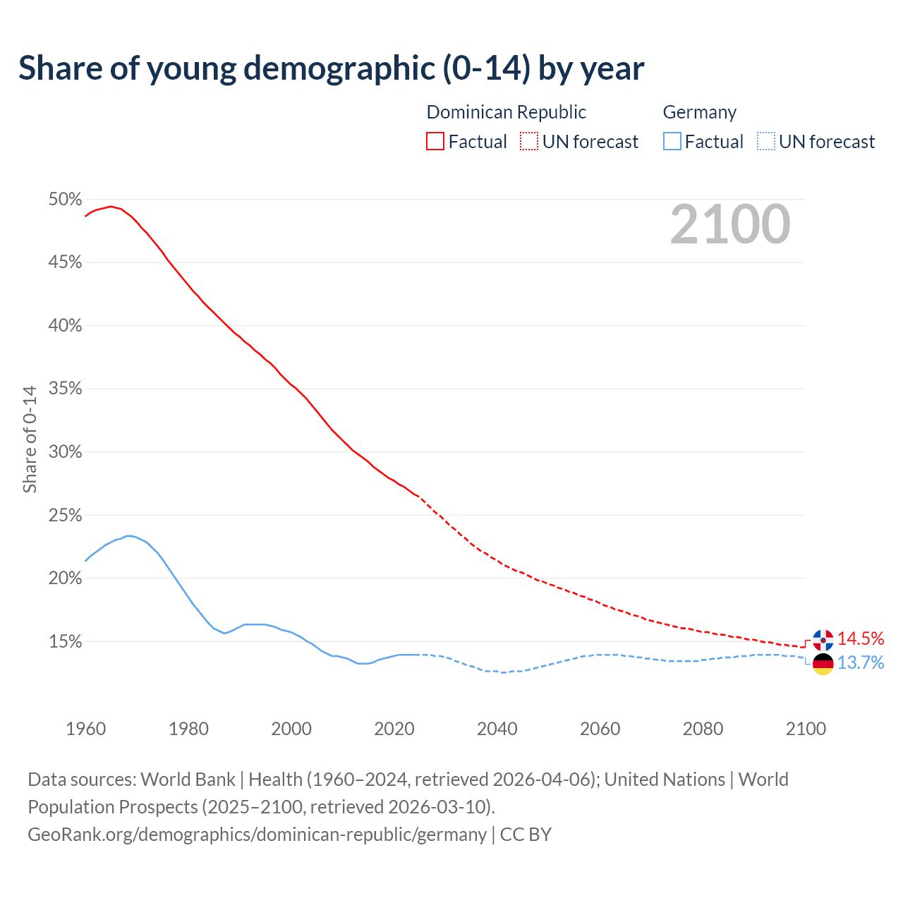 - The share of young demographic (0-15 years old) in the Dominican Republic is 26.6% vs 13.9% in Germany.