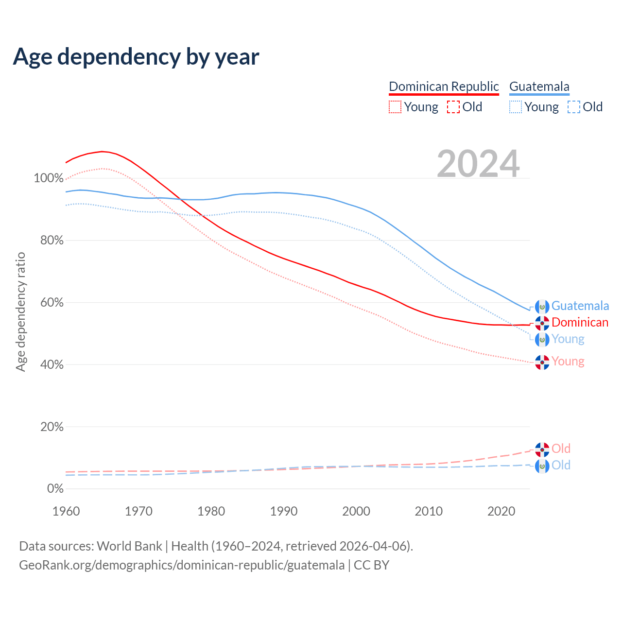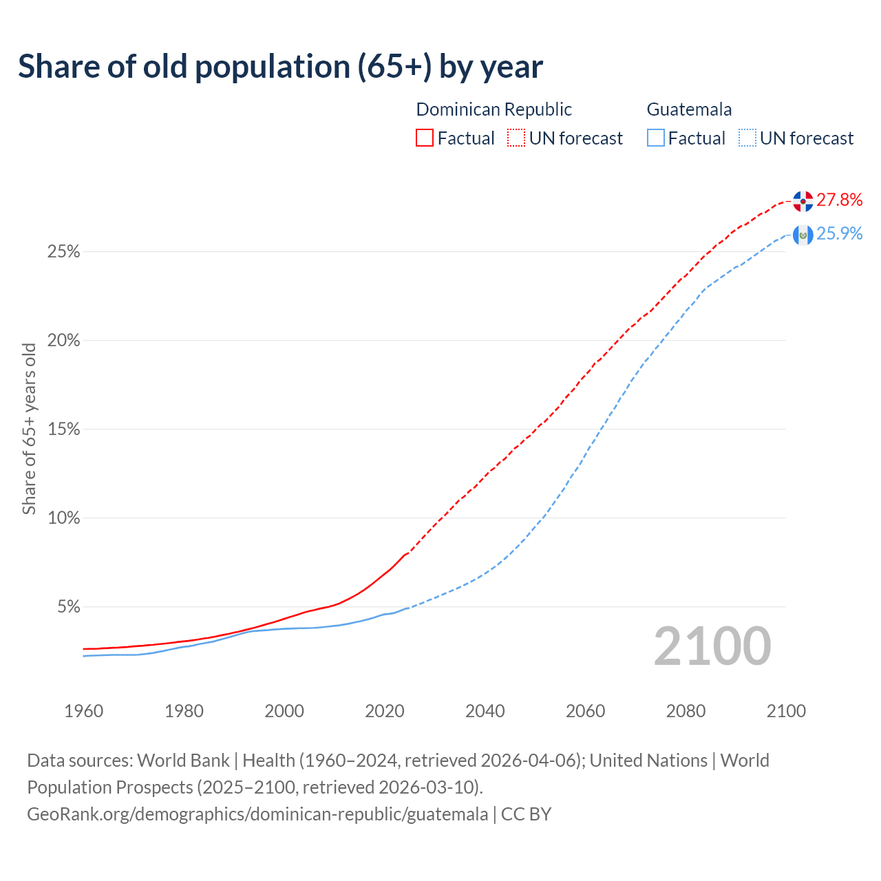 The share of older people aged 65 and over is 7.88% in the Dominican Republic and 4.85% in Guatemala. Life expectancy in the Dominican Republic compared to Guatemala .