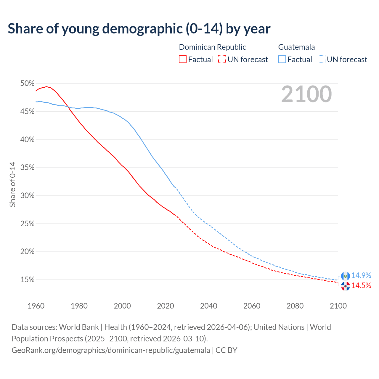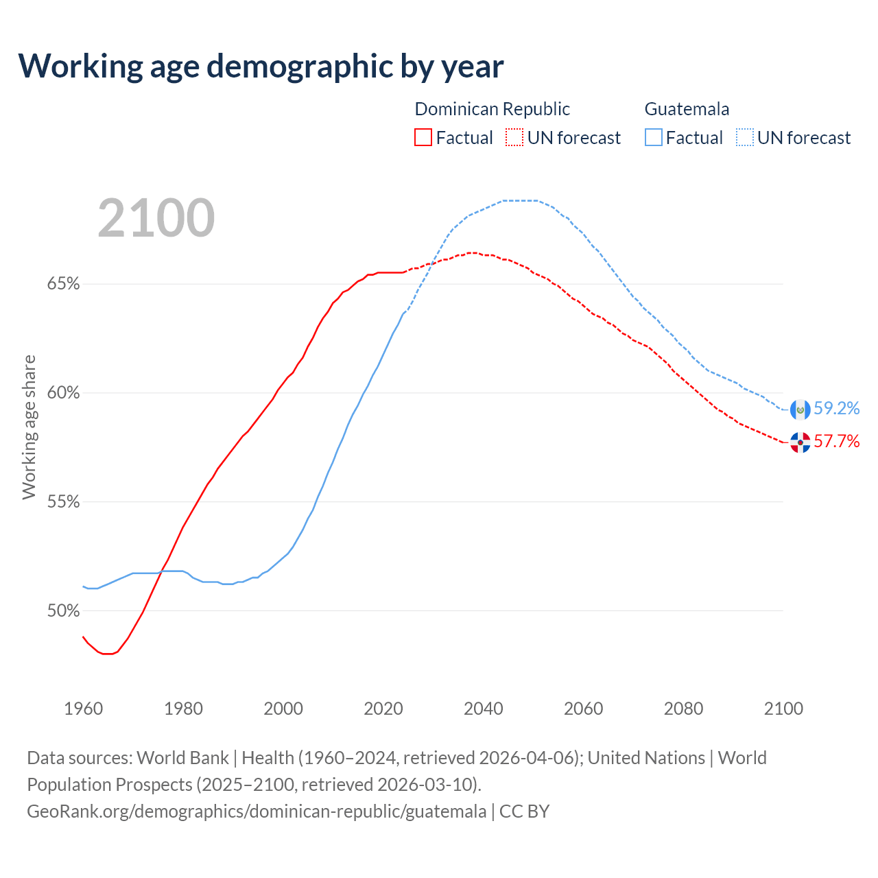Median age Dominican Republic vs Guatemala, 1960-2100