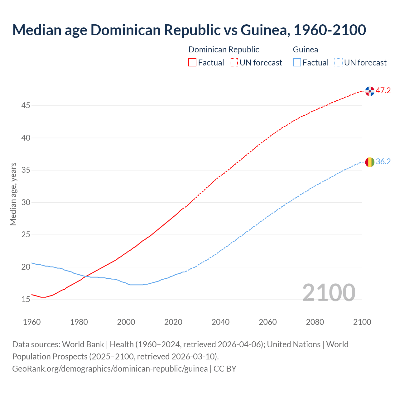 - The Dominican Republic is ranked 112/196 by median age (oldest to youngest) vs 176/196 for Guinea.