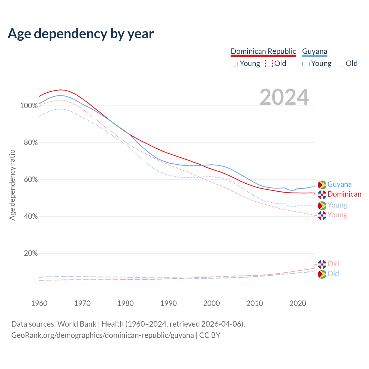- The Dominican Republic is ranked 112/196 by median age (oldest to youngest) vs 122/196 for Guyana.