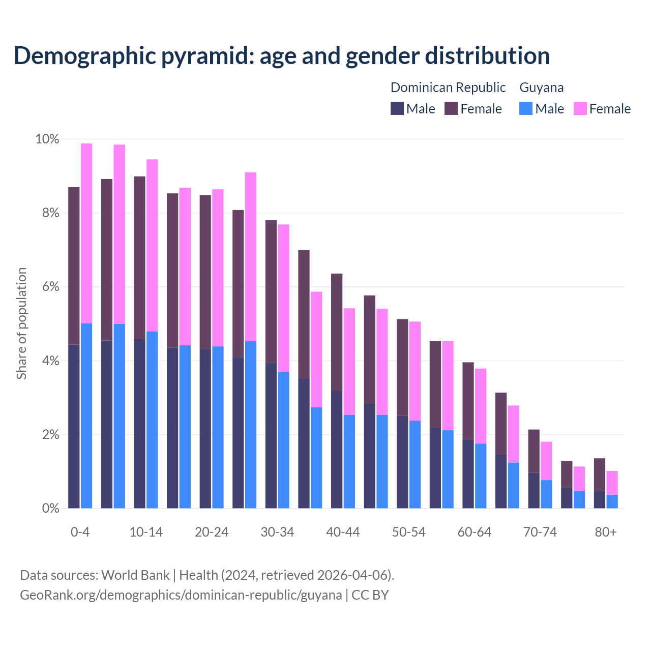 - As of 2026, the population of the Dominican Republic is 11.6M vs 842K in Guyana - 13.8 times difference.