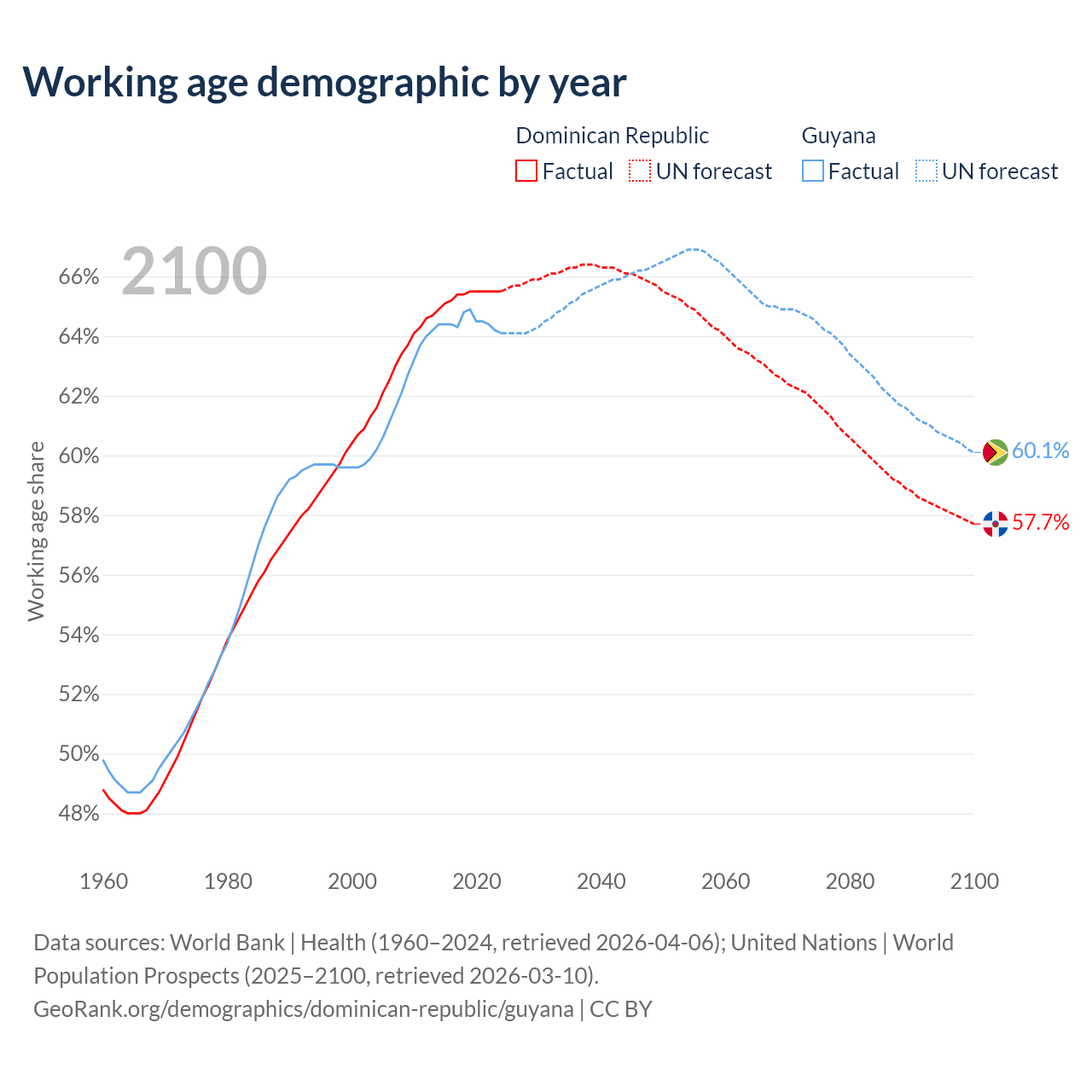 - The Dominican Republic has 7.63M working age adults (aged 15-64) vs 540K in Guyana.