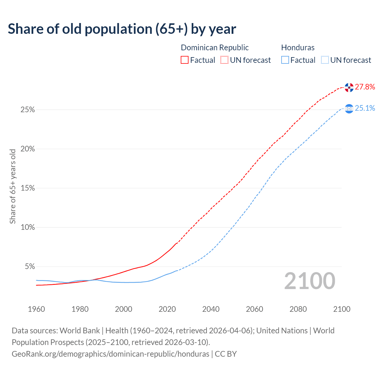 The share of older people aged 65 and over is 7.88% in the Dominican Republic and 4.42% in Honduras. Life expectancy in the Dominican Republic compared to Honduras .