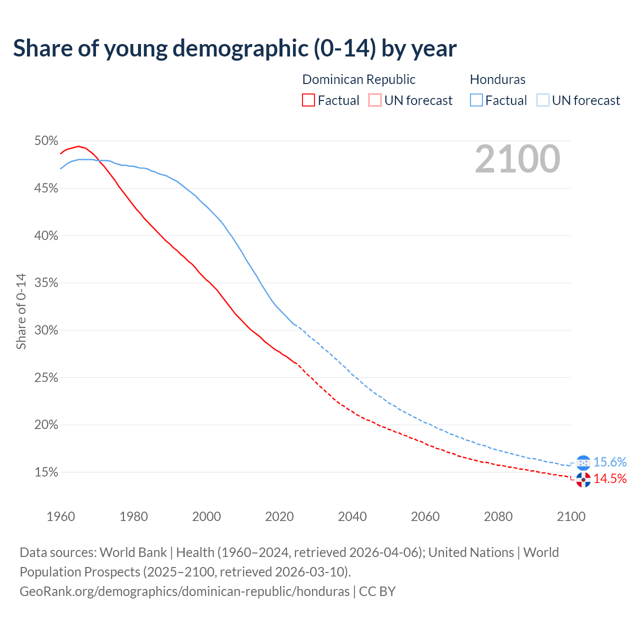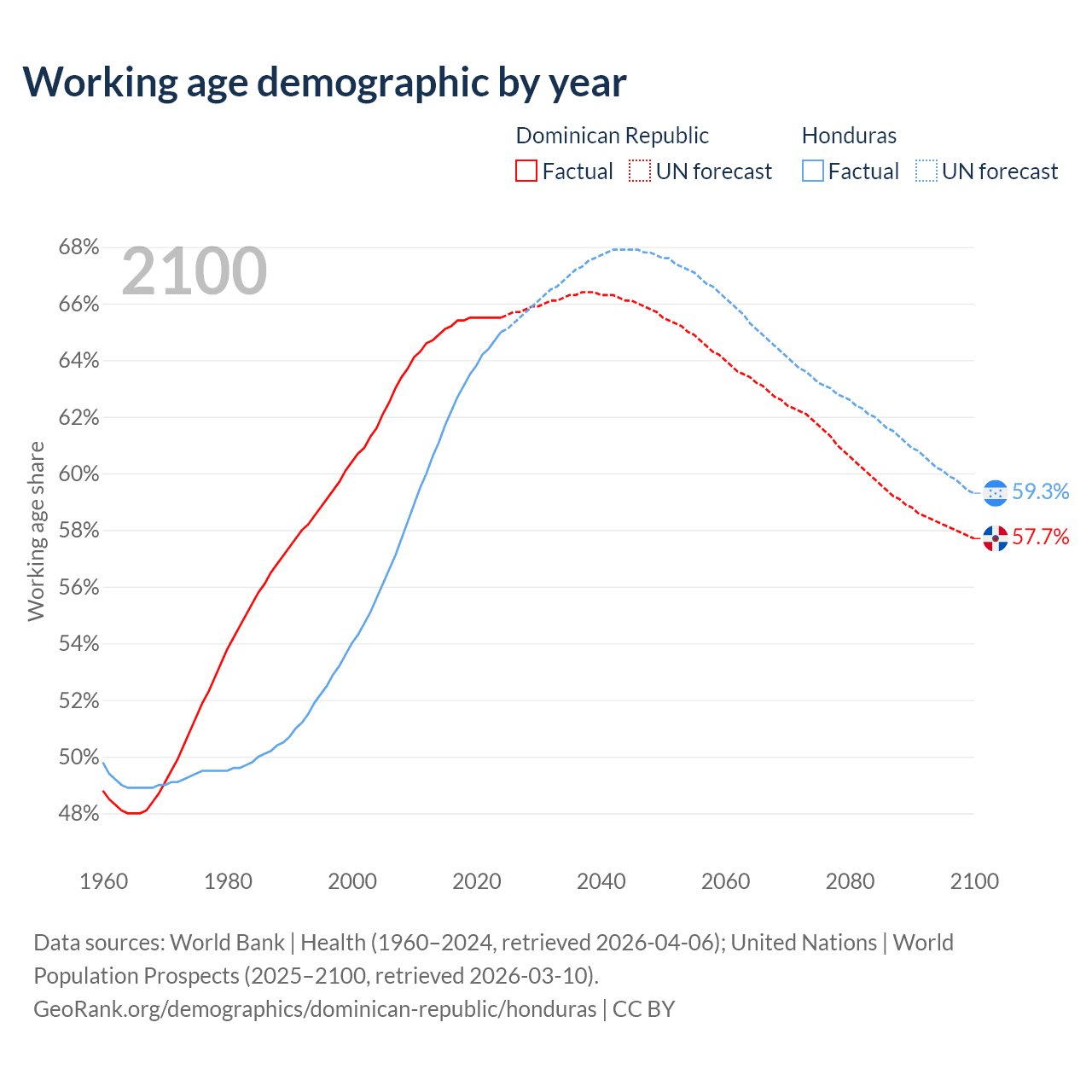 Median age Dominican Republic vs Honduras, 1960-2100