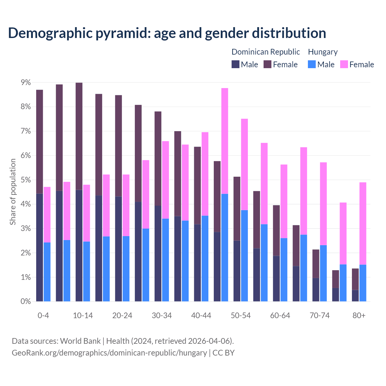 - The median age in the Dominican Republic is 29 years compared to 44.6 years in Hungary.