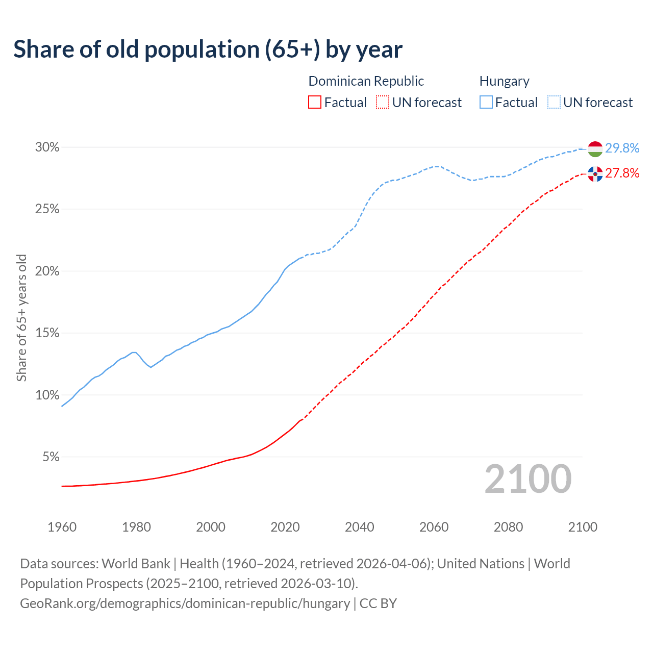 The share of older people aged 65 and over is 7.88% in the Dominican Republic and 21% in Hungary. Life expectancy in the Dominican Republic compared to Hungary .