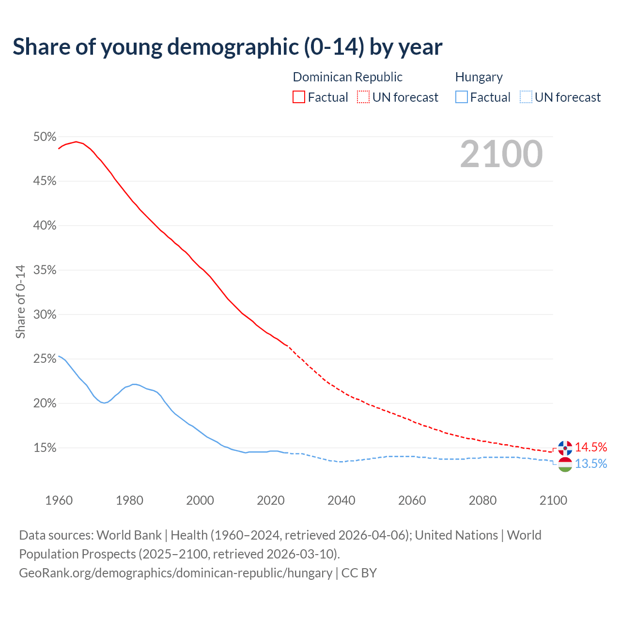 - The share of young demographic (0-15 years old) in the Dominican Republic is 26.6% vs 14.4% in Hungary.