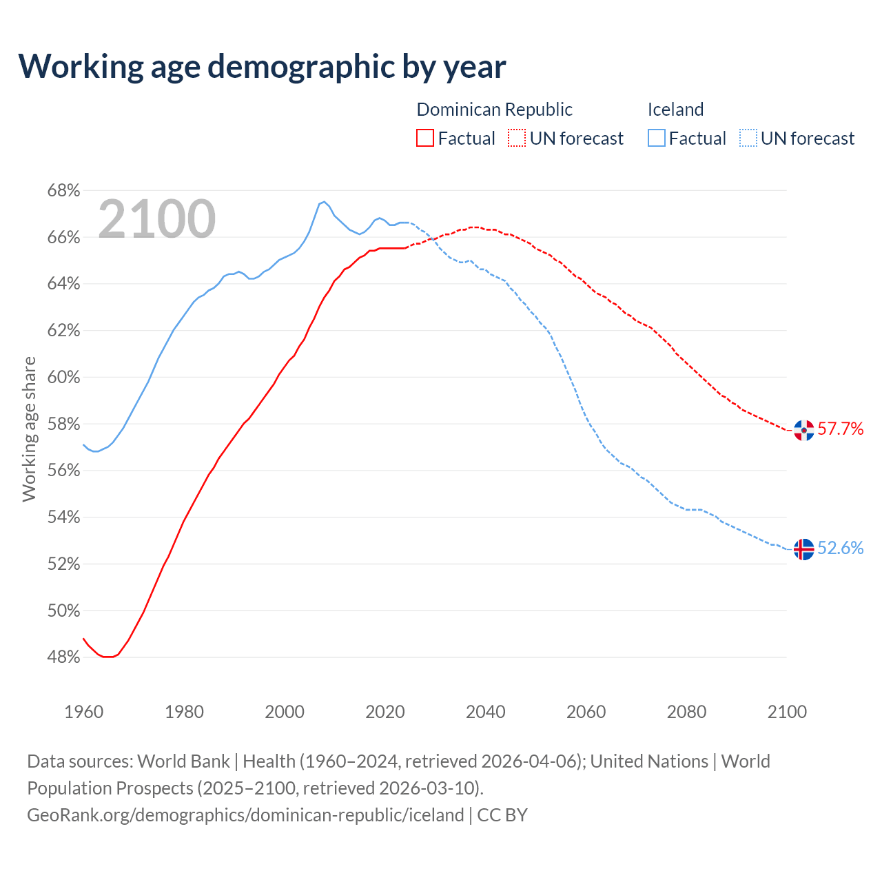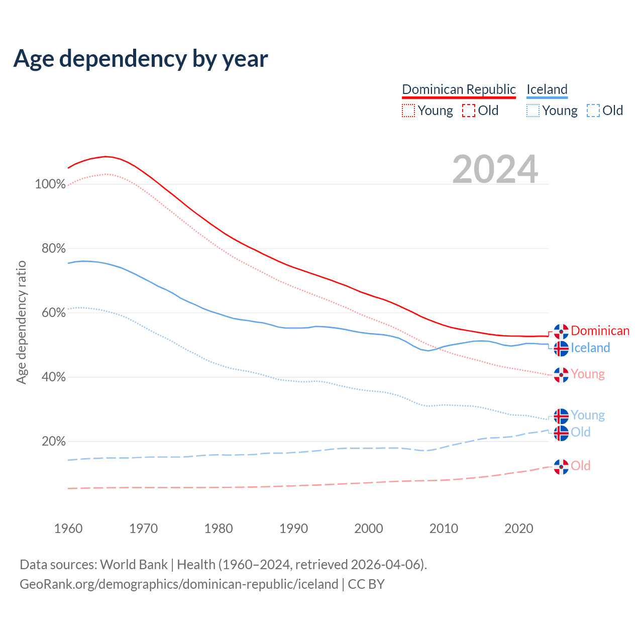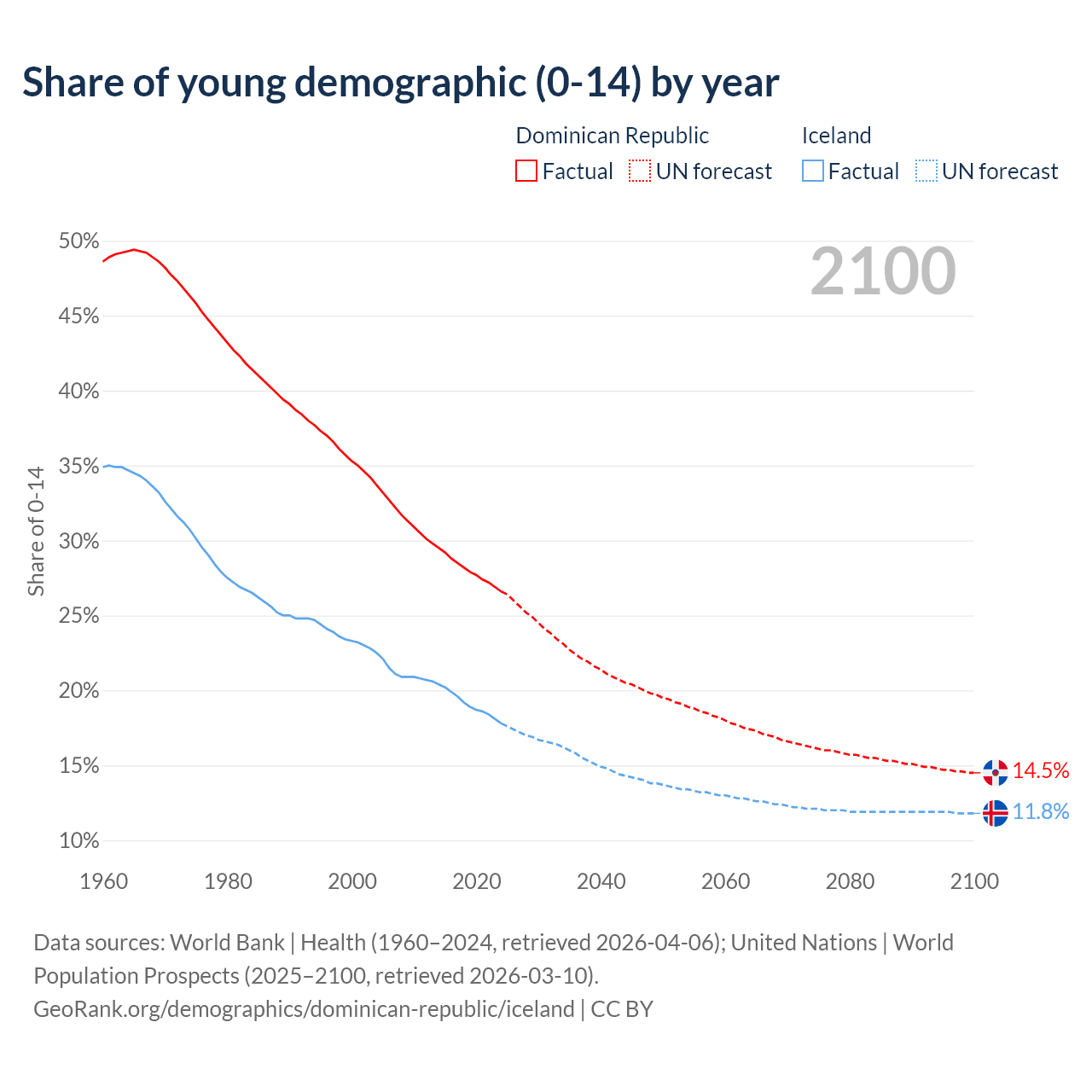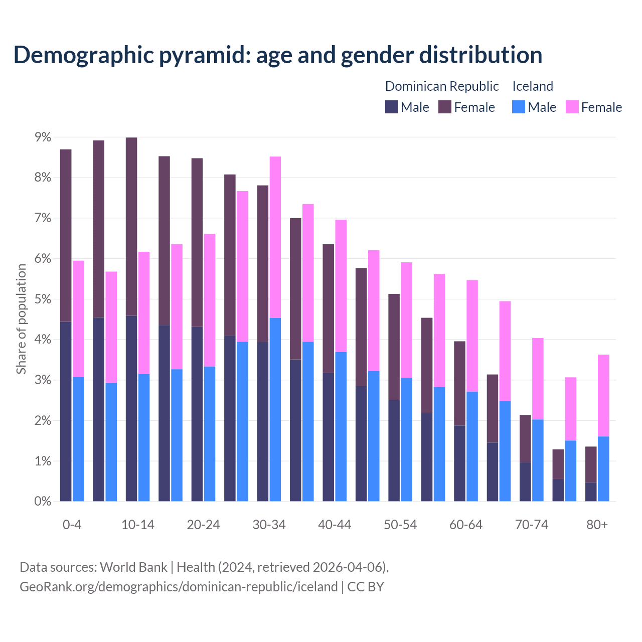 - The share of young demographic (0-15 years old) in the Dominican Republic is 26.6% vs 17.8% in Iceland.