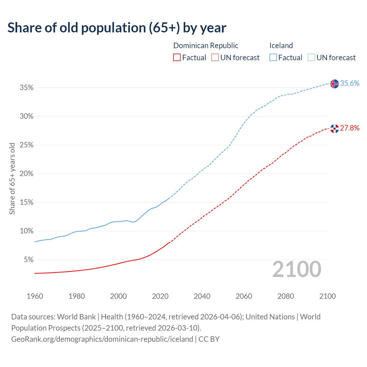 - The share of old-age demographic (65+) in the Dominican Republic is 7.88% vs 15.6% in Iceland.