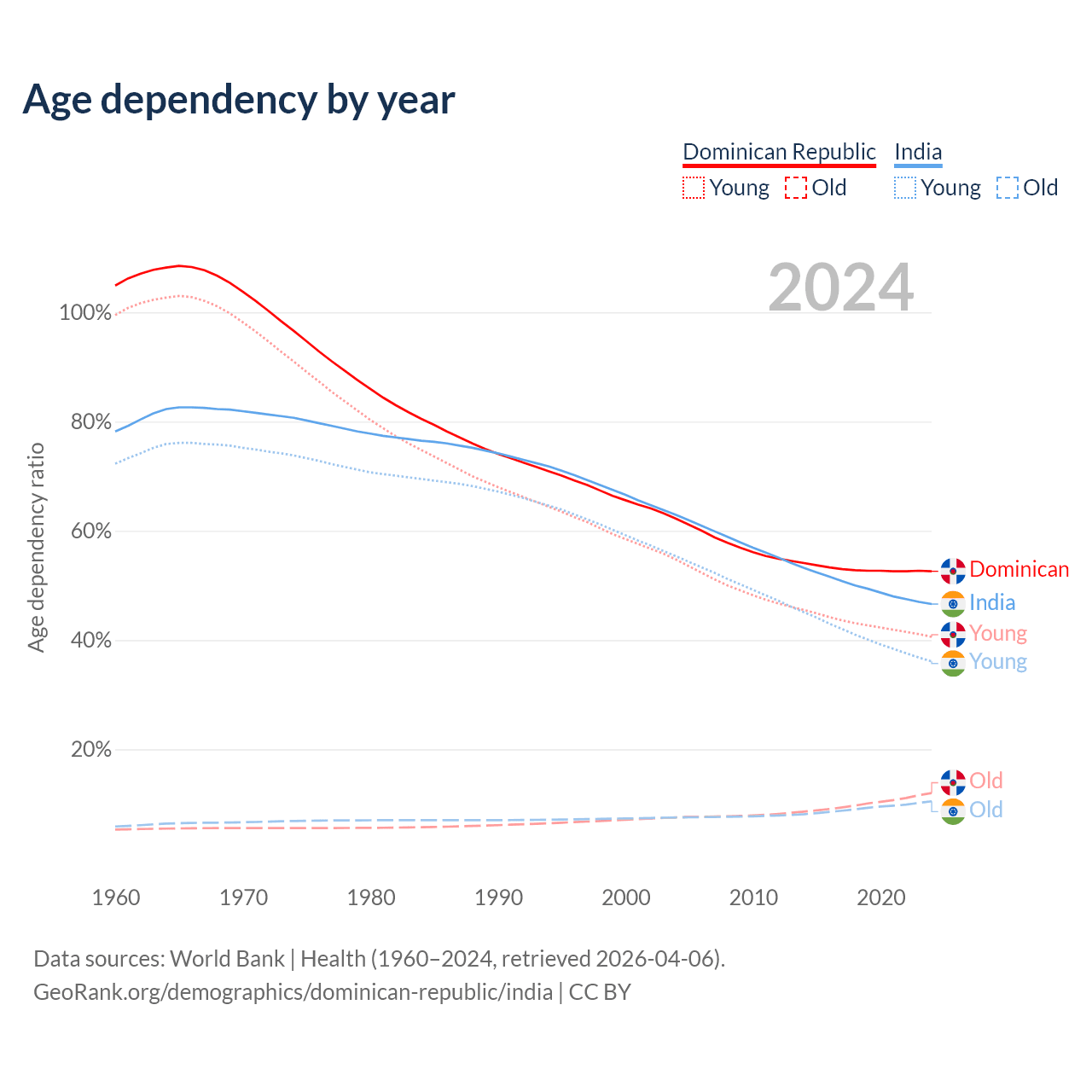 The share of older people aged 65 and over is 7.88% in the Dominican Republic and 7.15% in India. Life expectancy in the Dominican Republic compared to India .