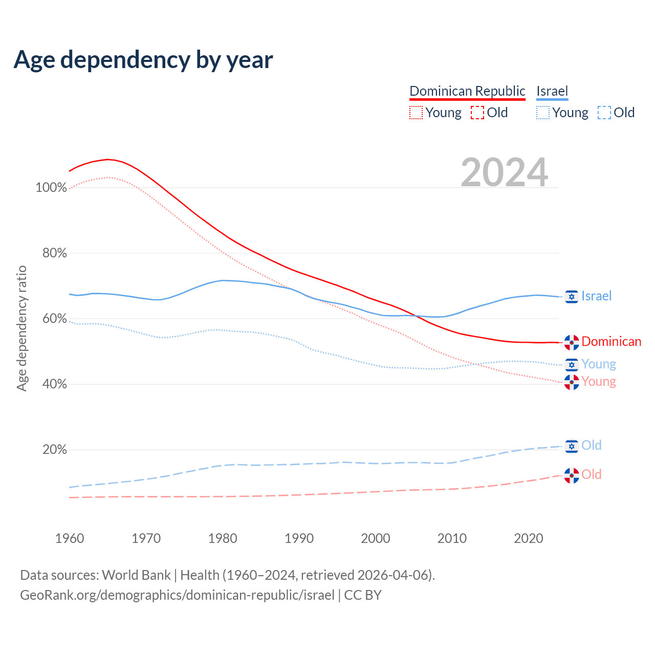 - The Dominican Republic is ranked 112/196 by median age (oldest to youngest) vs 103/196 for Israel.