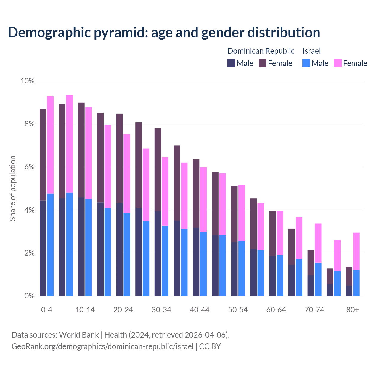 - As of 2026, the population of the Dominican Republic is 11.6M vs 10.3M in Israel.