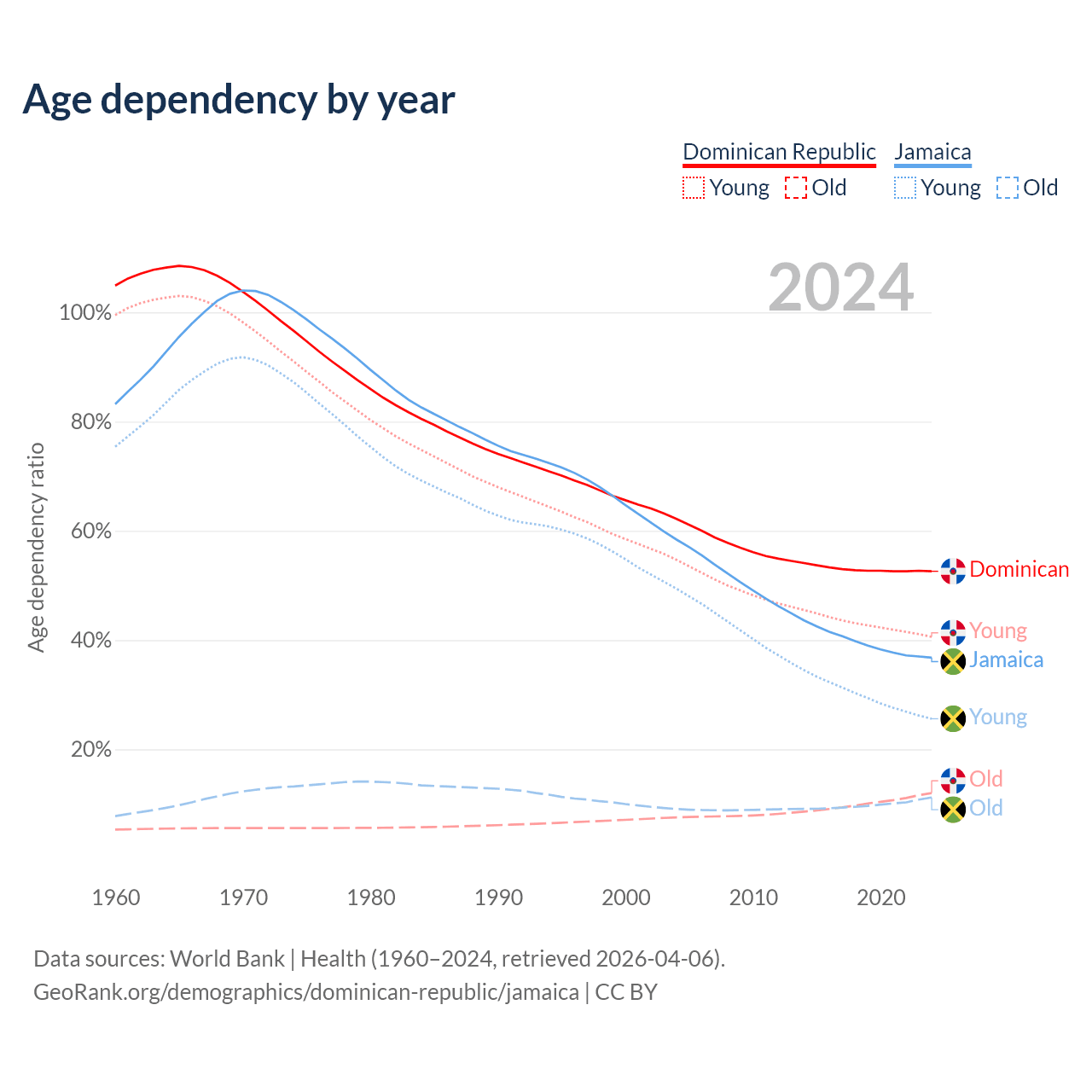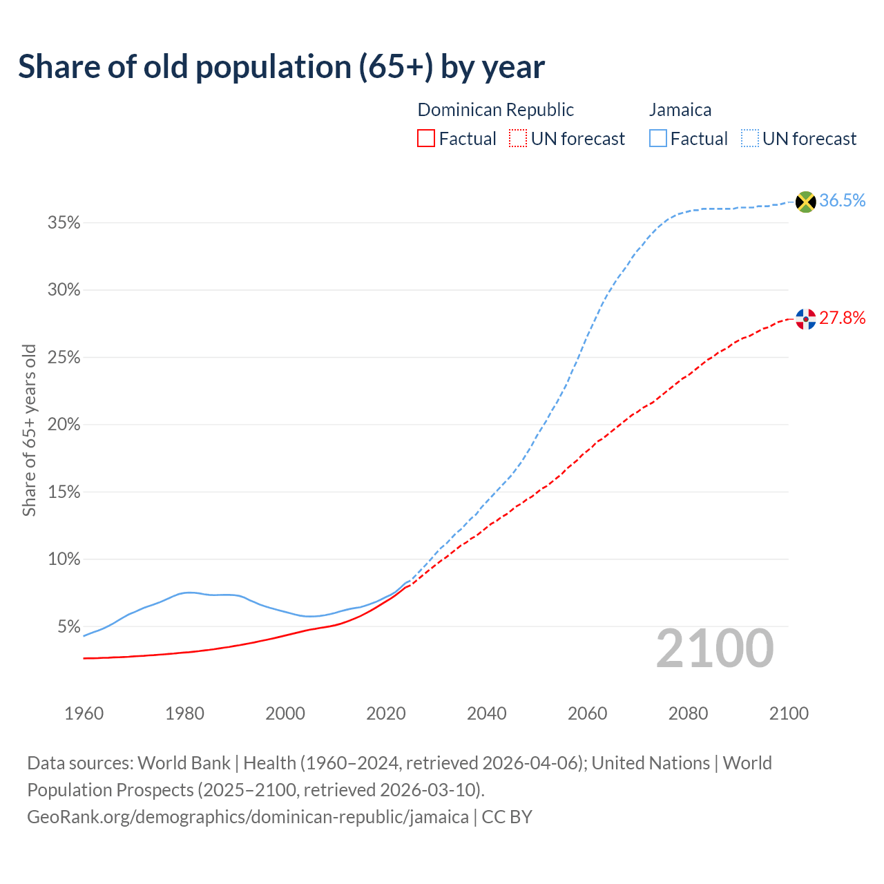 The share of older people aged 65 and over is 7.88% in the Dominican Republic and 8.21% in Jamaica. Life expectancy in the Dominican Republic compared to Jamaica .