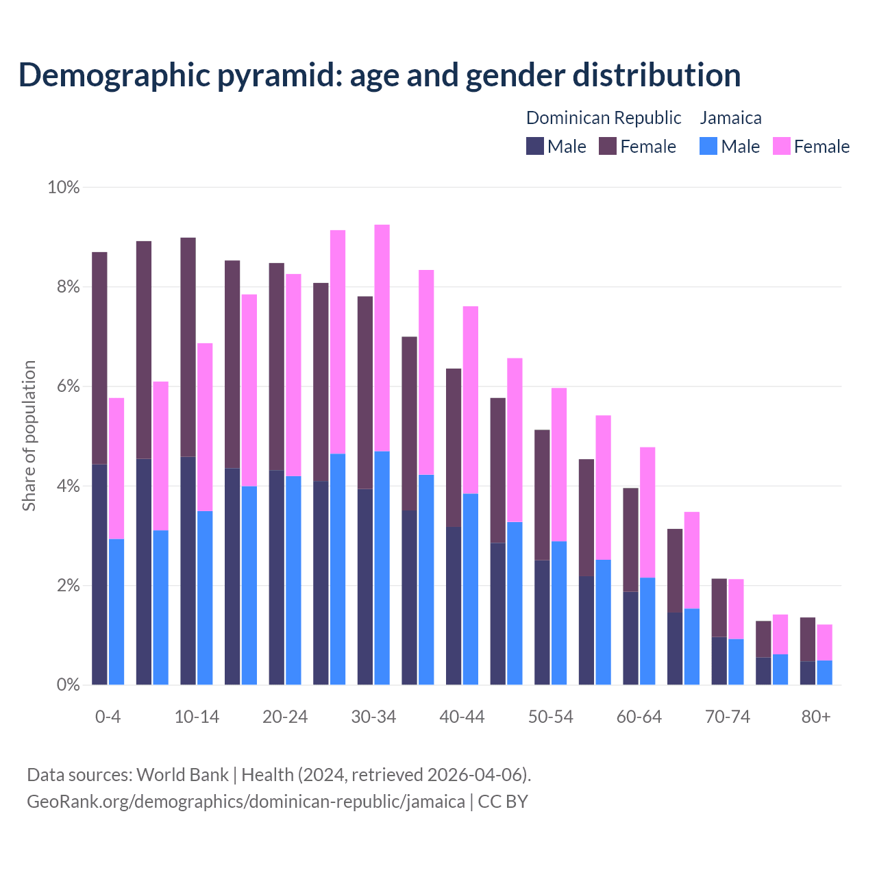 - The Dominican Republic is ranked 112/196 by median age (oldest to youngest) vs 87/196 for Jamaica.