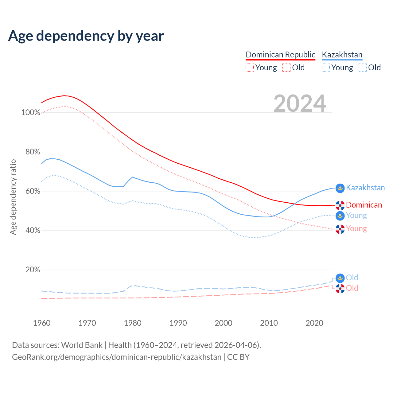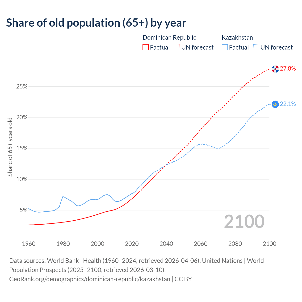 - The share of old-age demographic (65+) in the Dominican Republic is 7.88% vs 8.65% in Kazakhstan.