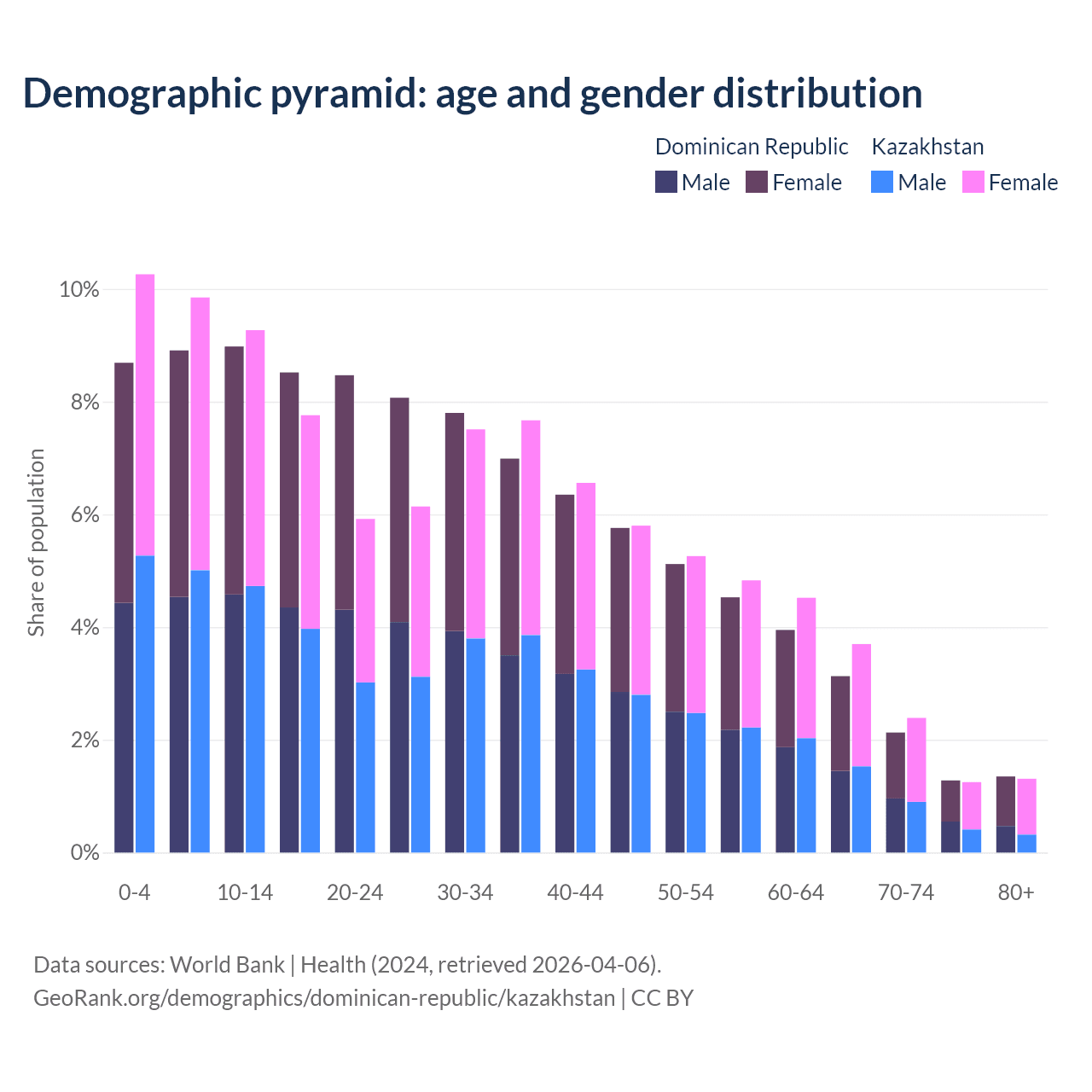 - The median age in the Dominican Republic is 29 years compared to 30.5 years in Kazakhstan.
