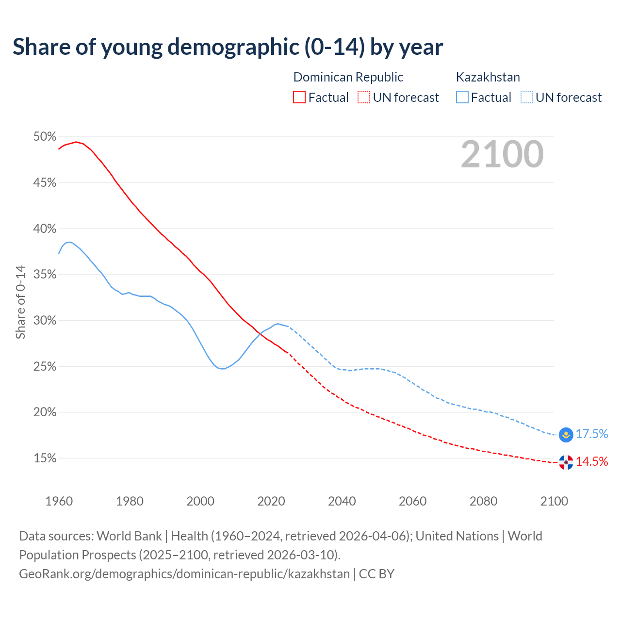 - The share of young demographic (0-15 years old) in the Dominican Republic is 26.6% vs 29.4% in Kazakhstan.
