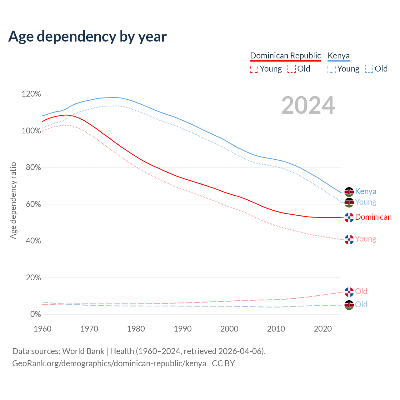 The share of older people aged 65 and over is 7.88% in the Dominican Republic and 2.97% in Kenya. Life expectancy in the Dominican Republic compared to Kenya .