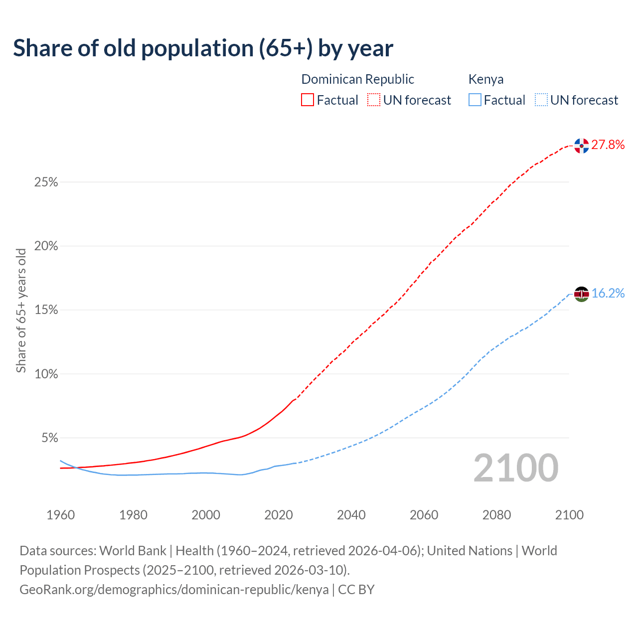 - The share of old-age demographic (65+) in the Dominican Republic is 7.88% vs 2.97% in Kenya.