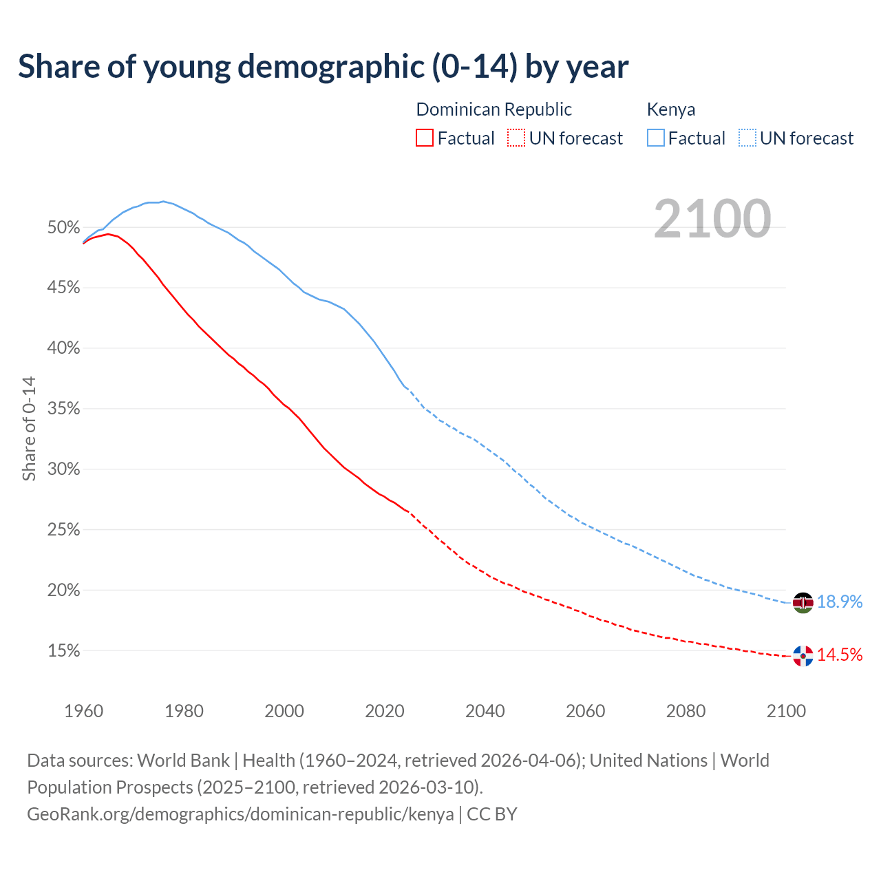 - The share of young demographic (0-15 years old) in the Dominican Republic is 26.6% vs 36.8% in Kenya.
