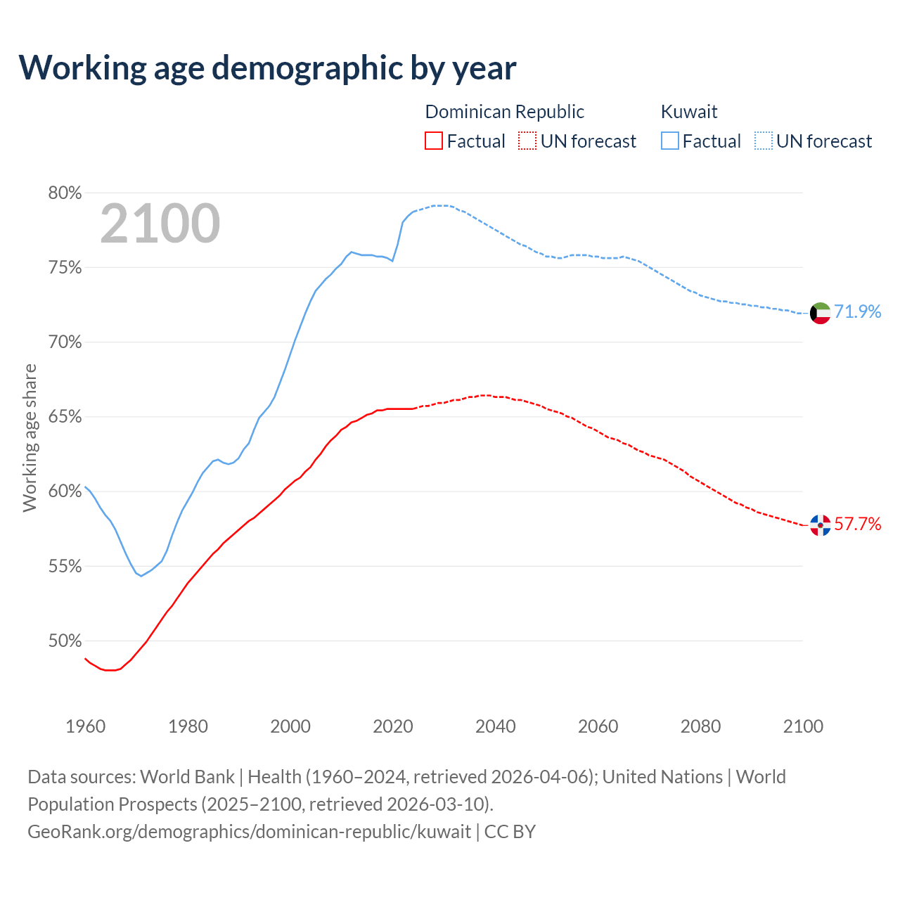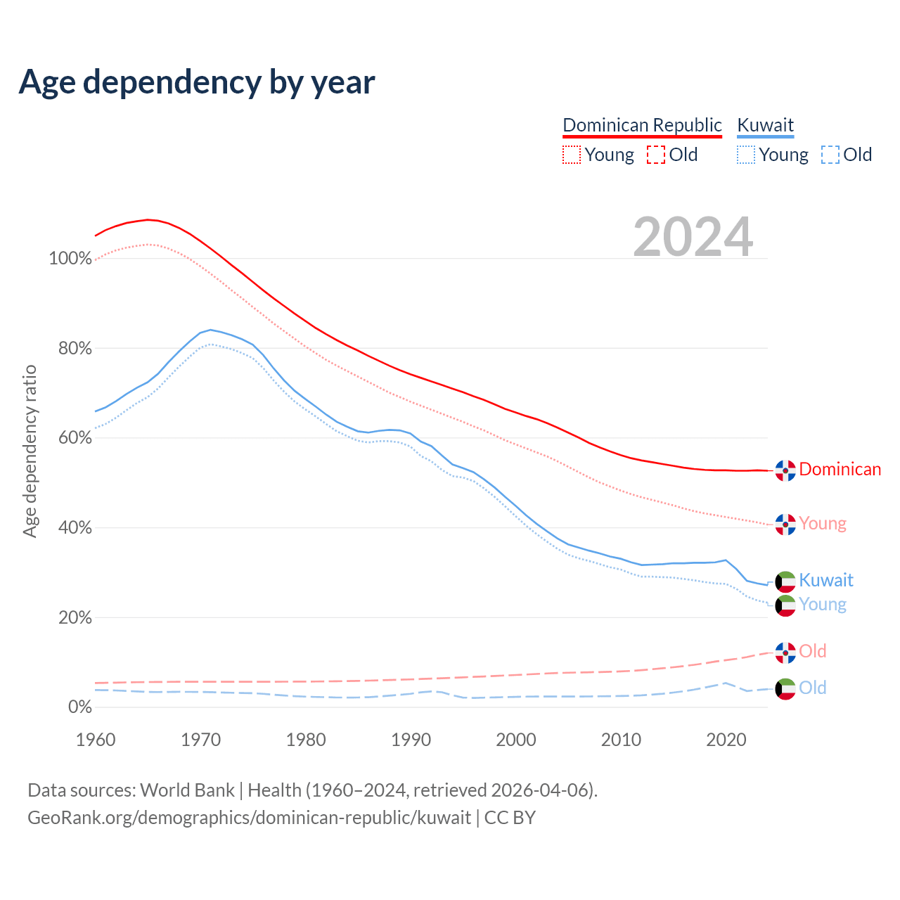 The share of older people aged 65 and over is 7.88% in the Dominican Republic and 3.1% in Kuwait. Life expectancy in the Dominican Republic compared to Kuwait .