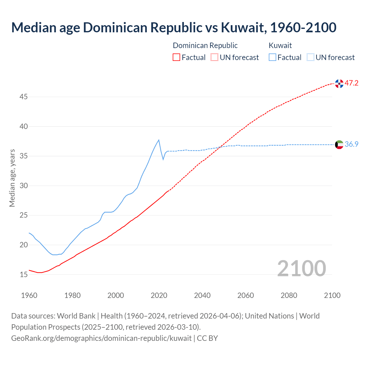 Median age Dominican Republic vs Kuwait, 1960-2100