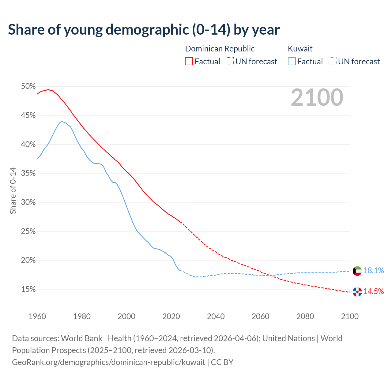 - The share of young demographic (0-15 years old) in the Dominican Republic is 26.6% vs 18.2% in Kuwait.