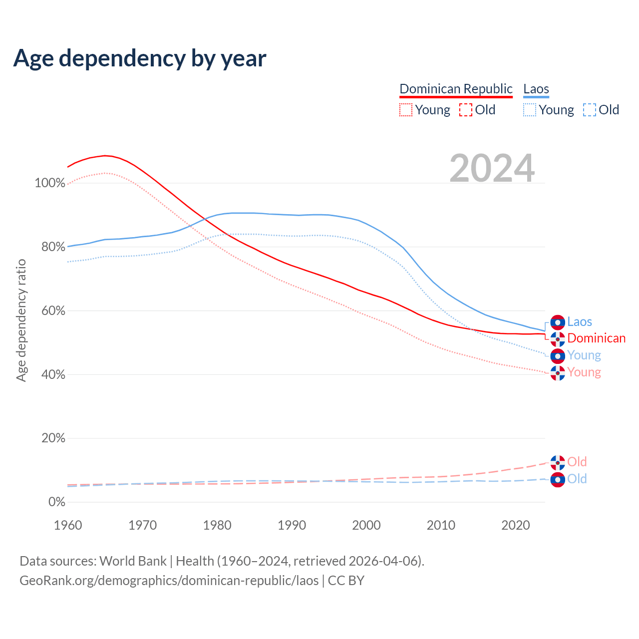 - The Dominican Republic is ranked 112/196 by median age (oldest to youngest) vs 130/196 for Laos.