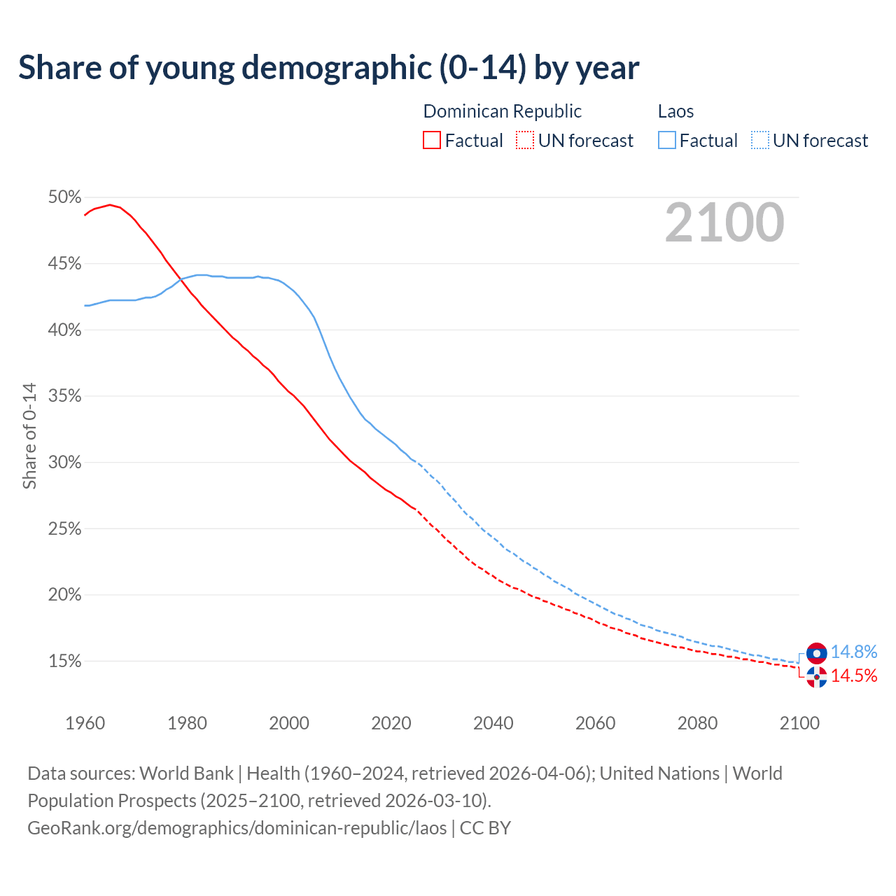 - The share of young demographic (0-15 years old) in the Dominican Republic is 26.6% vs 30.2% in Laos.