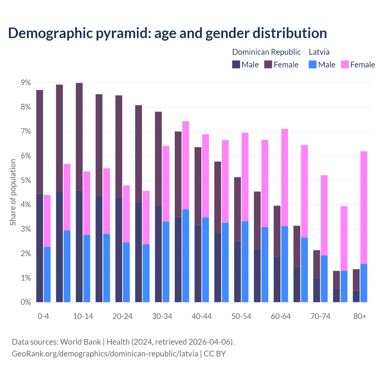 - The median age in the Dominican Republic is 29 years compared to 44.3 years in Latvia.