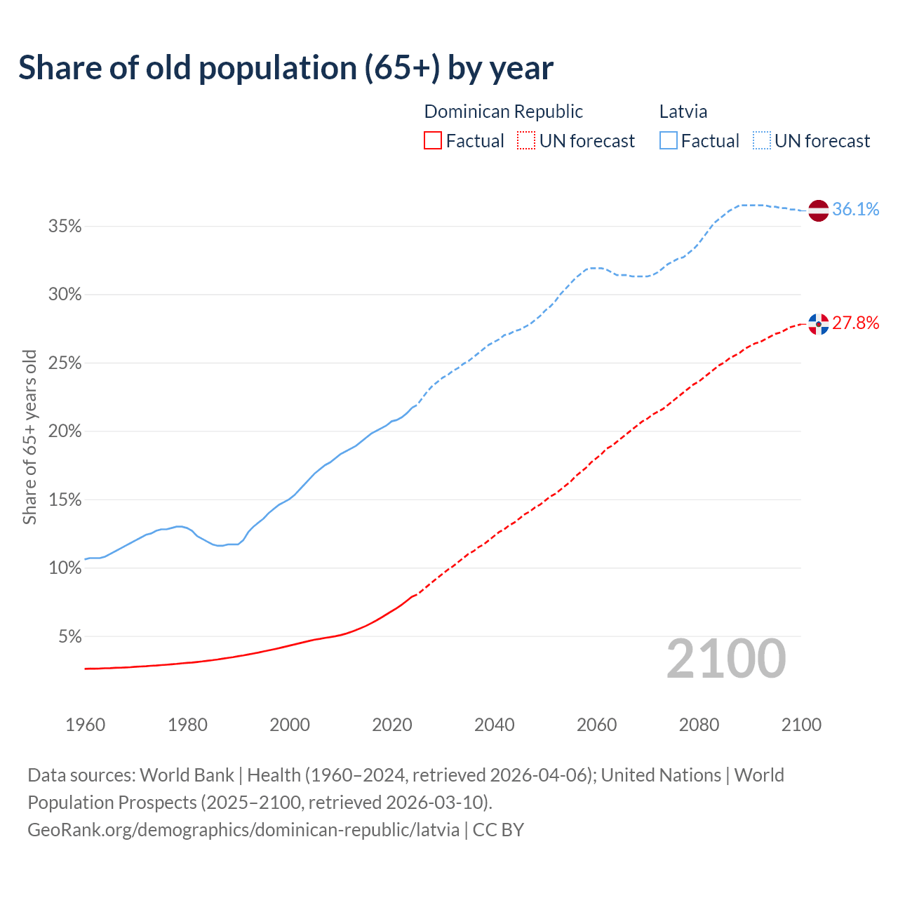 - The share of old-age demographic (65+) in the Dominican Republic is 7.88% vs 21.7% in Latvia.