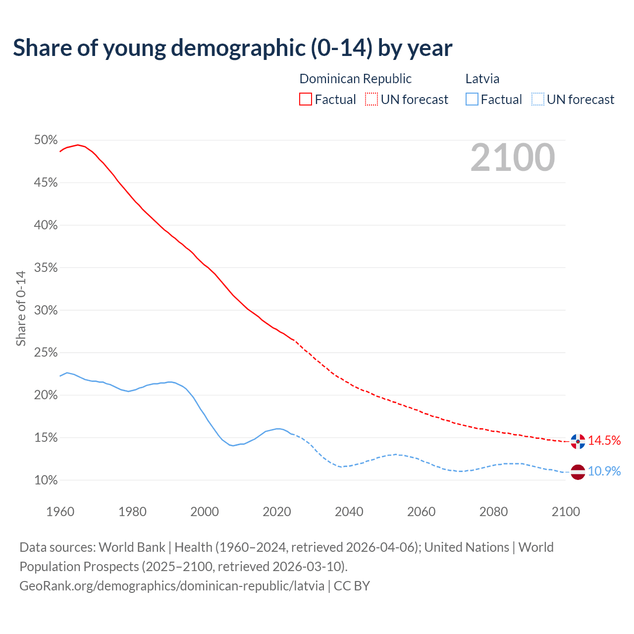 - The share of young demographic (0-15 years old) in the Dominican Republic is 26.6% vs 15.4% in Latvia.