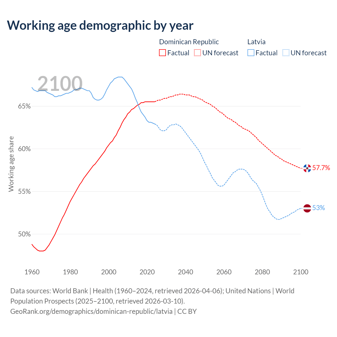 - The Dominican Republic has 7.63M working age adults (aged 15-64) vs 1.15M in Latvia.