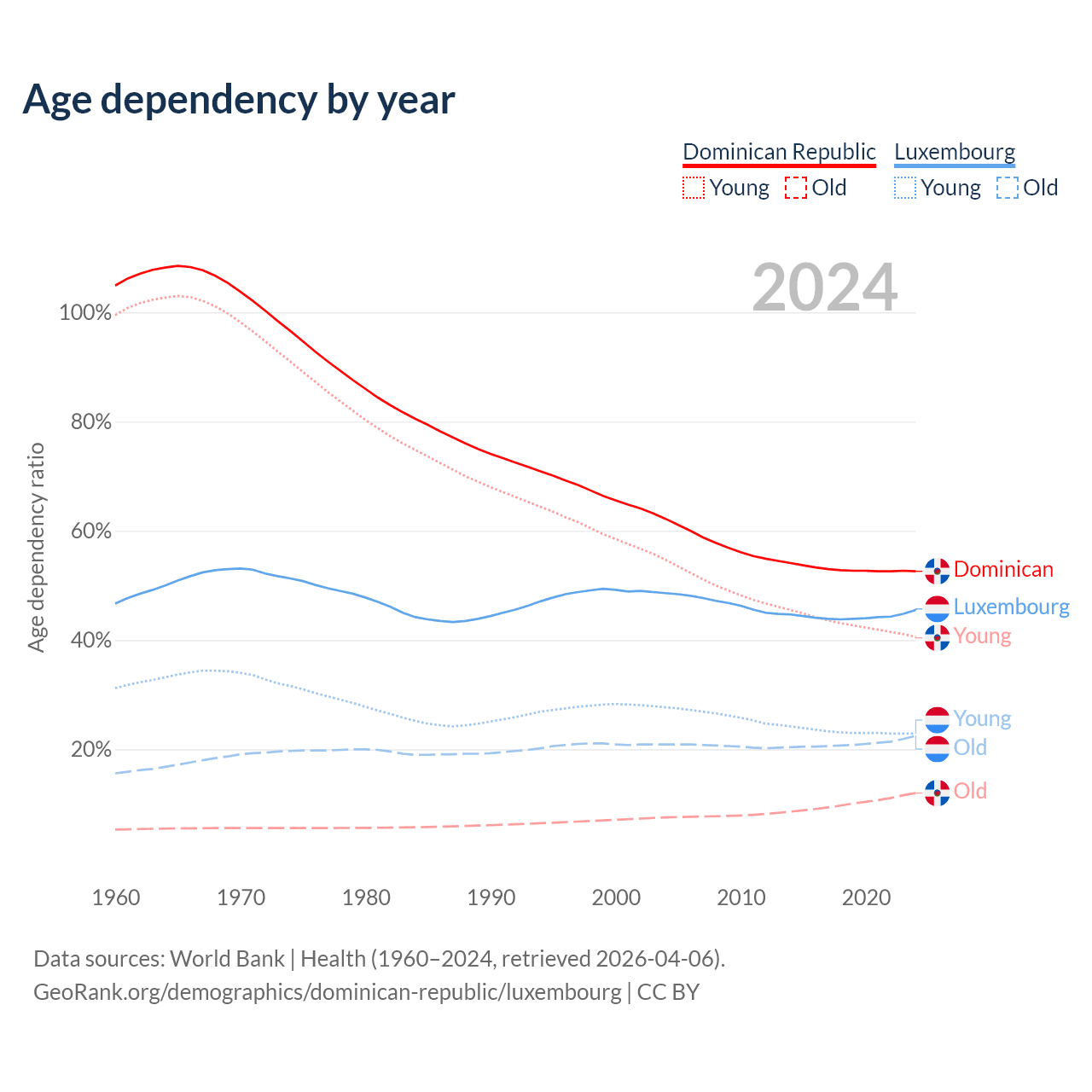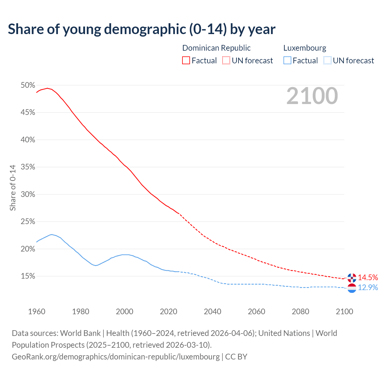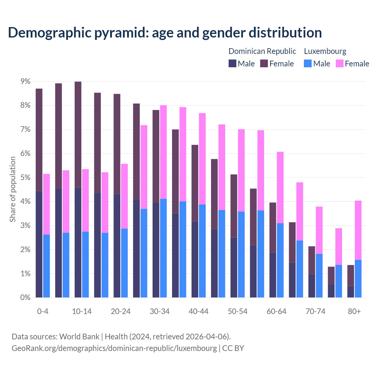 - The share of young demographic (0-15 years old) in the Dominican Republic is 26.6% vs 15.8% in Luxembourg.