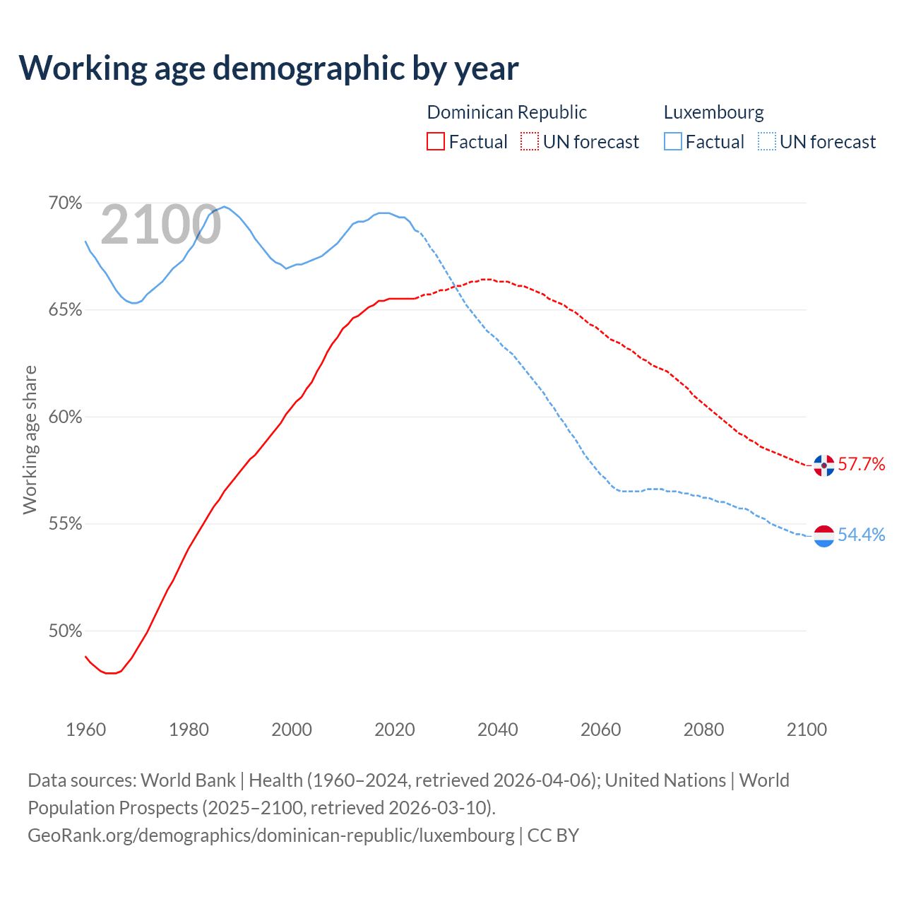 Median age Dominican Republic vs Luxembourg, 1960-2100