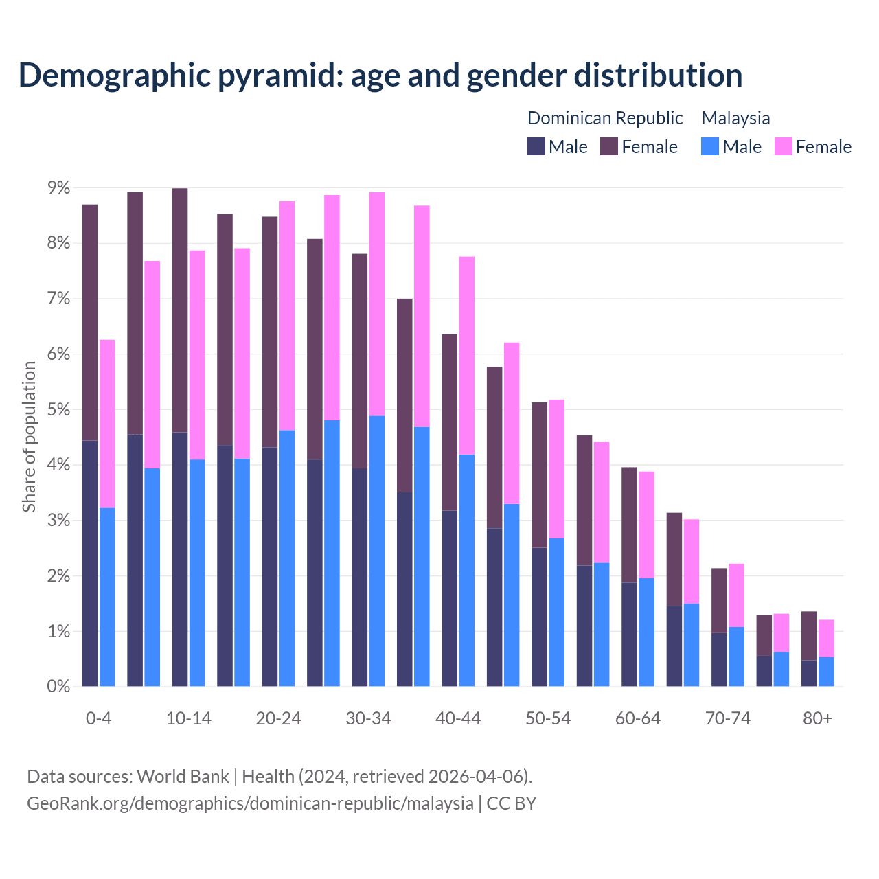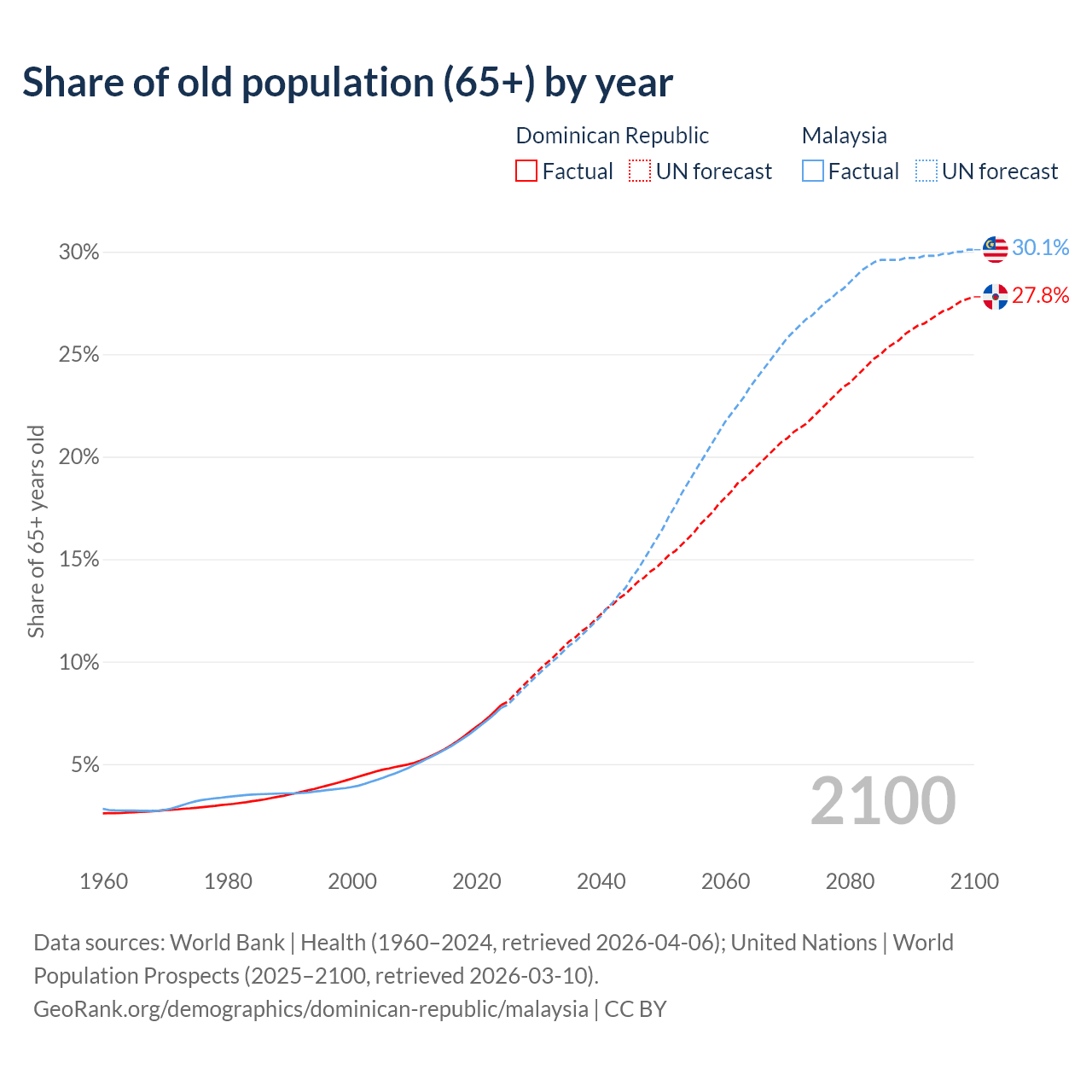 - The share of old-age demographic (65+) in the Dominican Republic is 7.88% vs 7.74% in Malaysia.