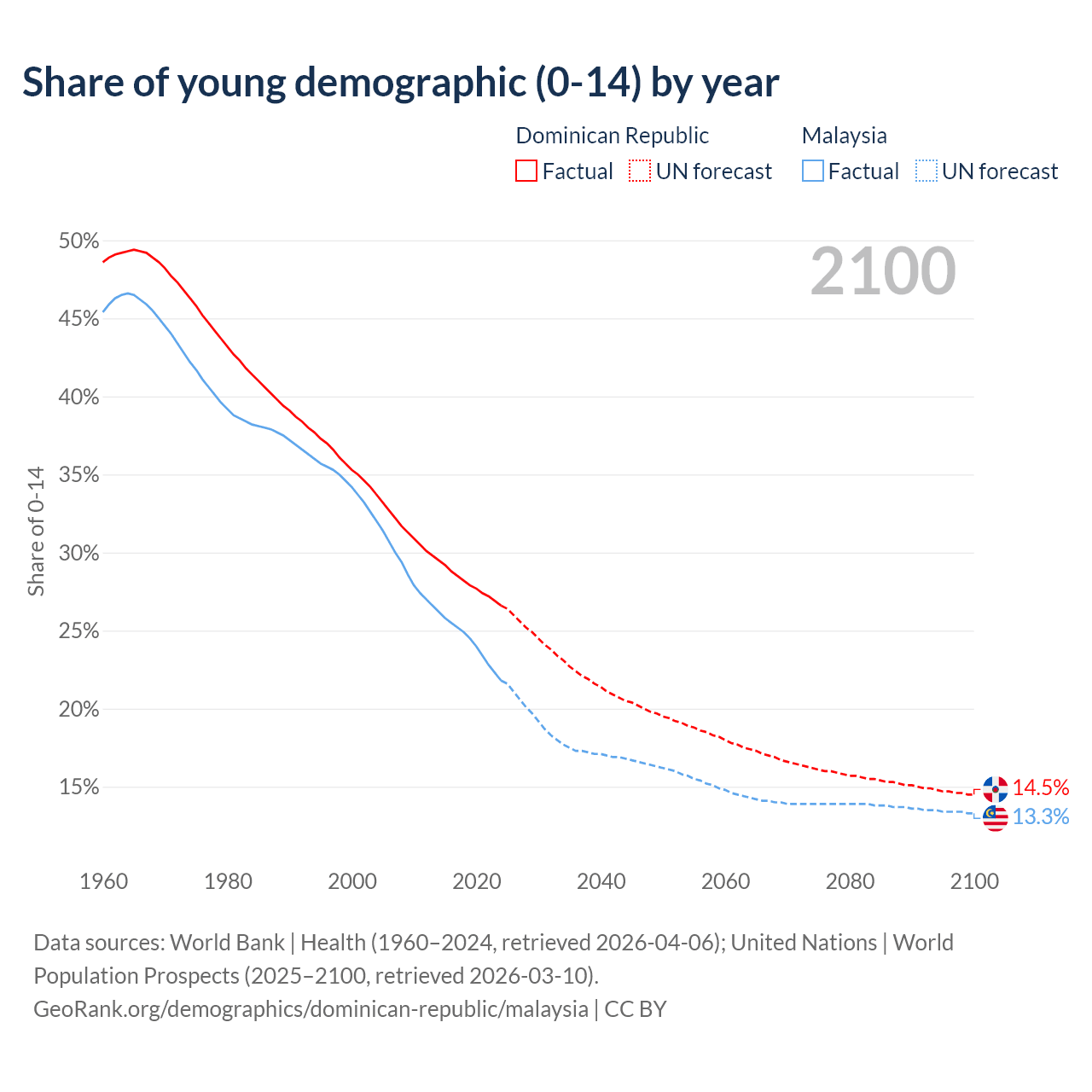 - The share of young demographic (0-15 years old) in the Dominican Republic is 26.6% vs 21.8% in Malaysia.