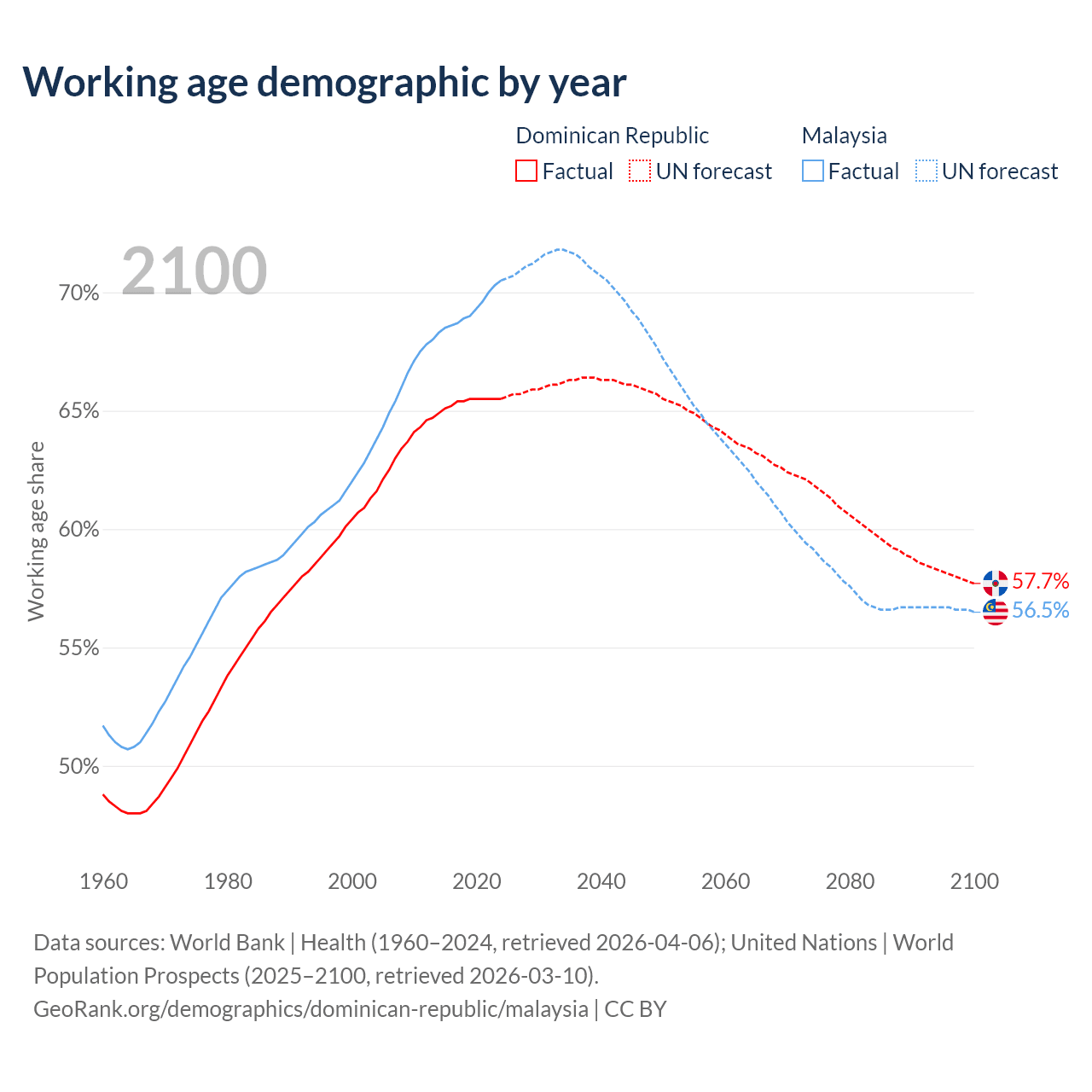 Median age Dominican Republic vs Malaysia, 1960-2100