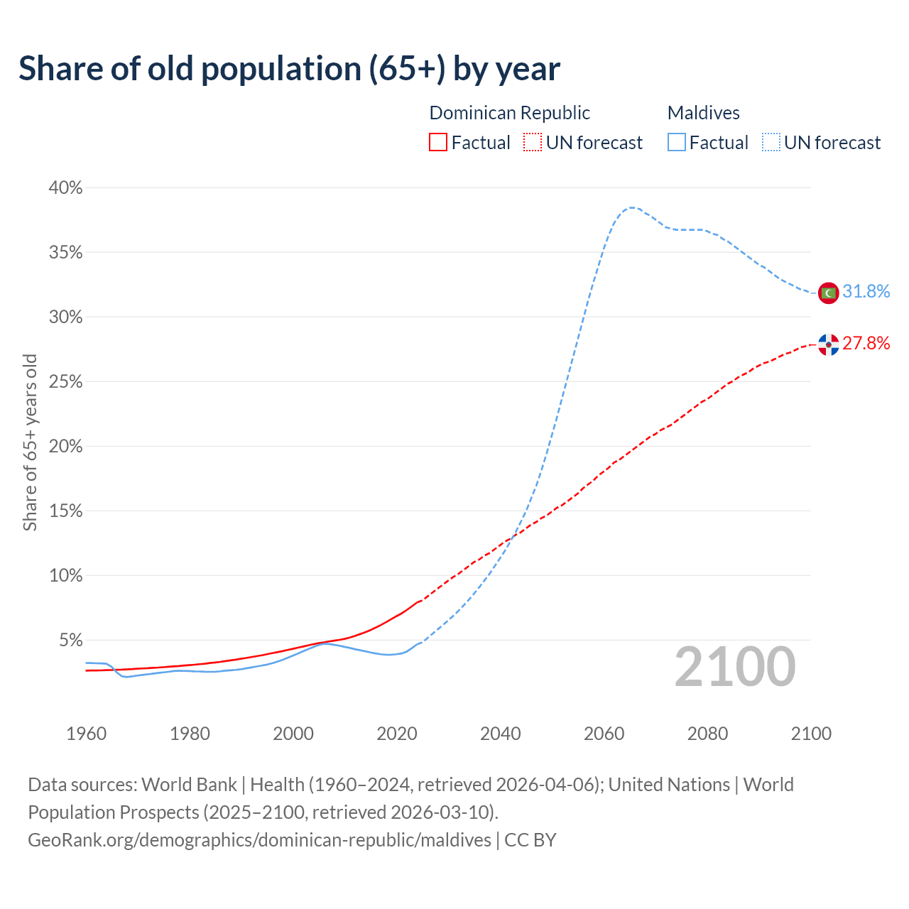 - The share of old-age demographic (65+) in the Dominican Republic is 7.88% vs 4.64% in Maldives.