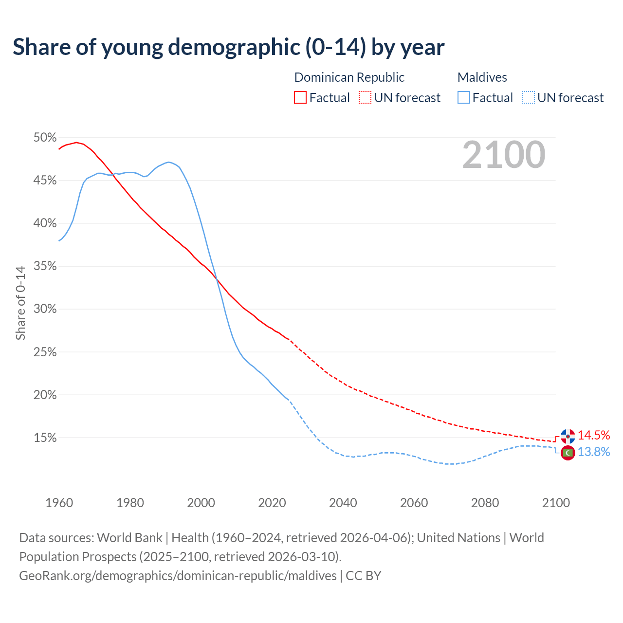 - The share of young demographic (0-15 years old) in the Dominican Republic is 26.6% vs 19.6% in Maldives.