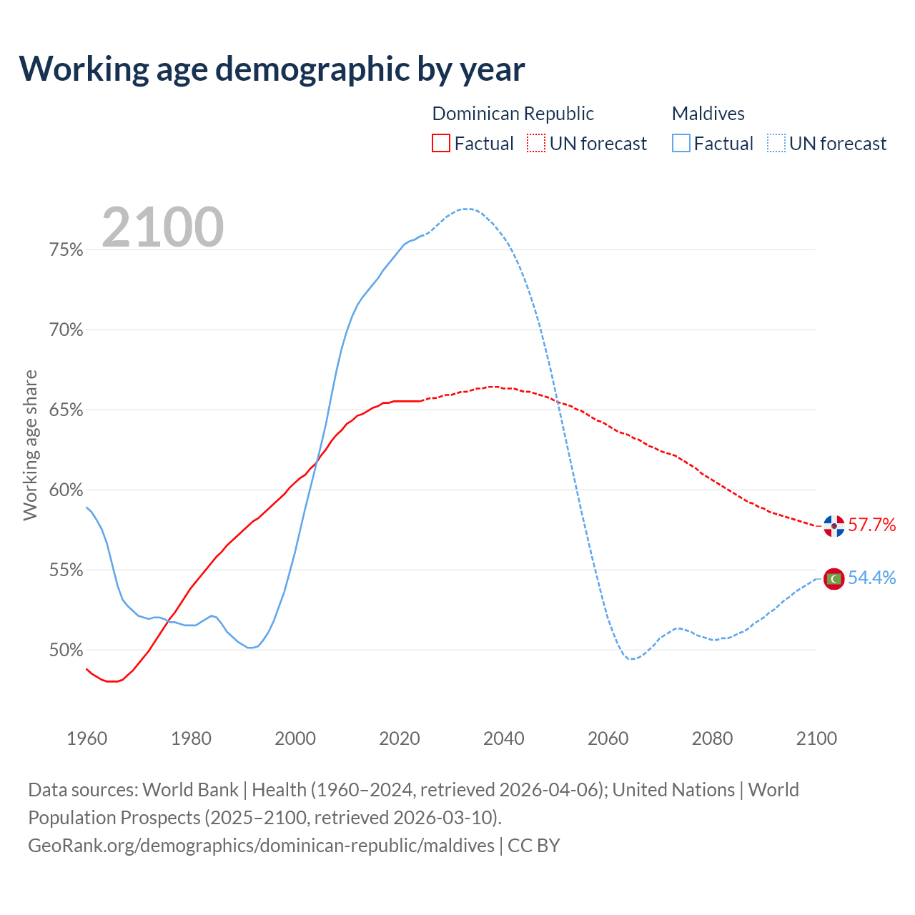 Median age Dominican Republic vs Maldives, 1960-2100