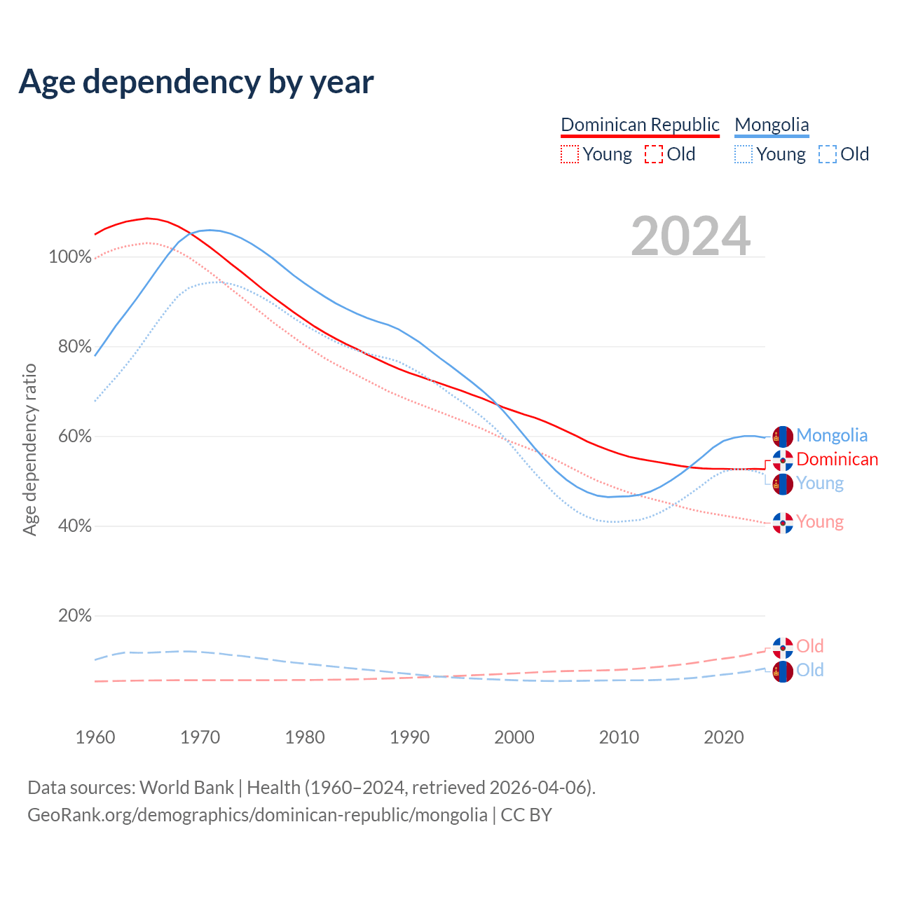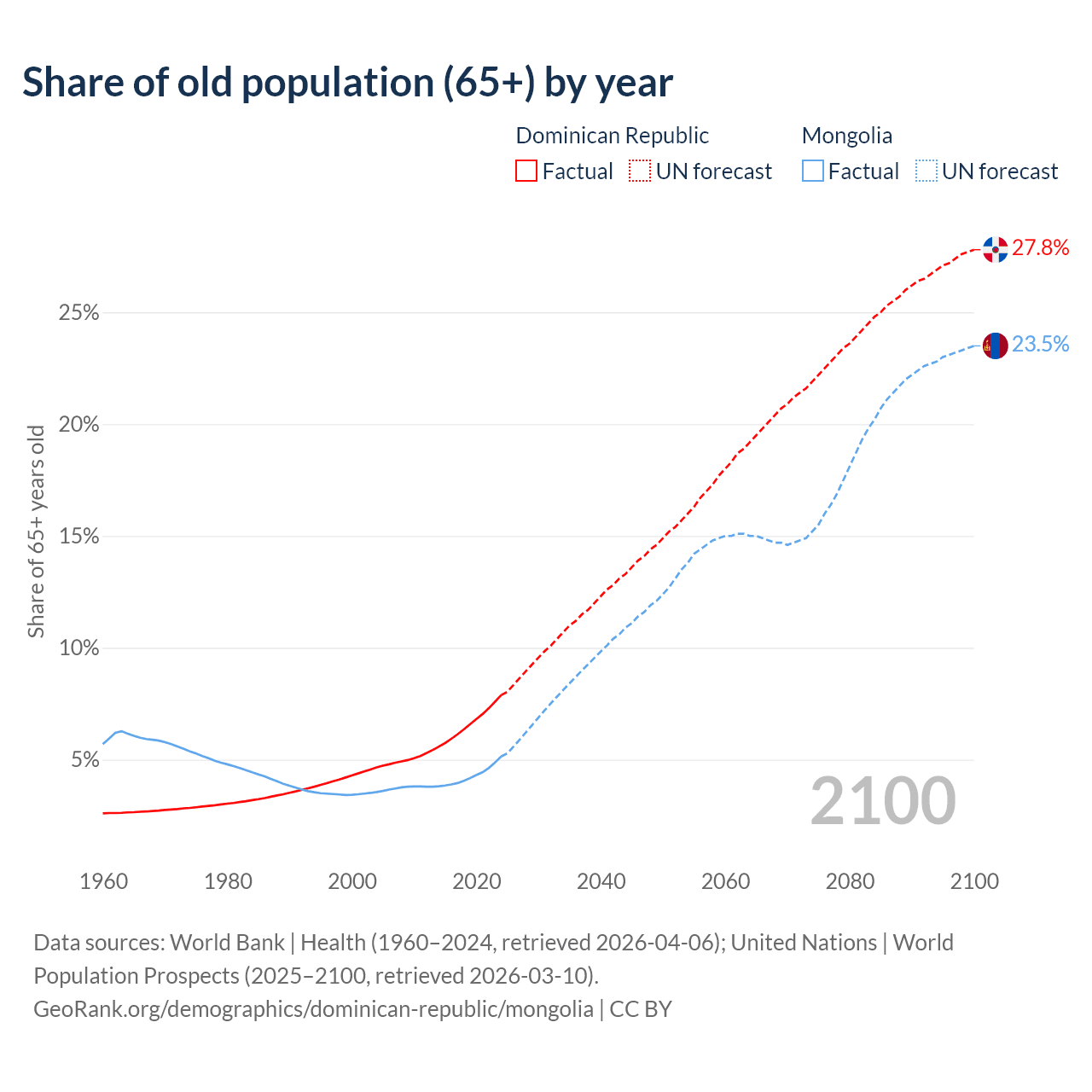 - The share of old-age demographic (65+) in the Dominican Republic is 7.88% vs 5.14% in Mongolia.