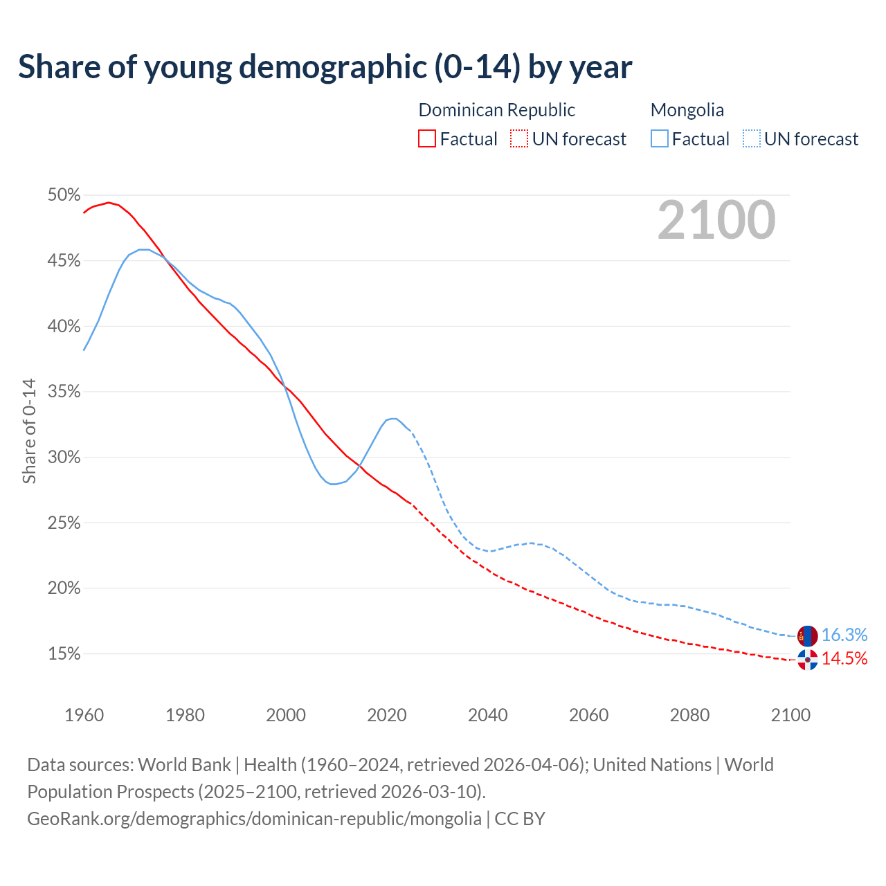 - The share of young demographic (0-15 years old) in the Dominican Republic is 26.6% vs 32.2% in Mongolia.