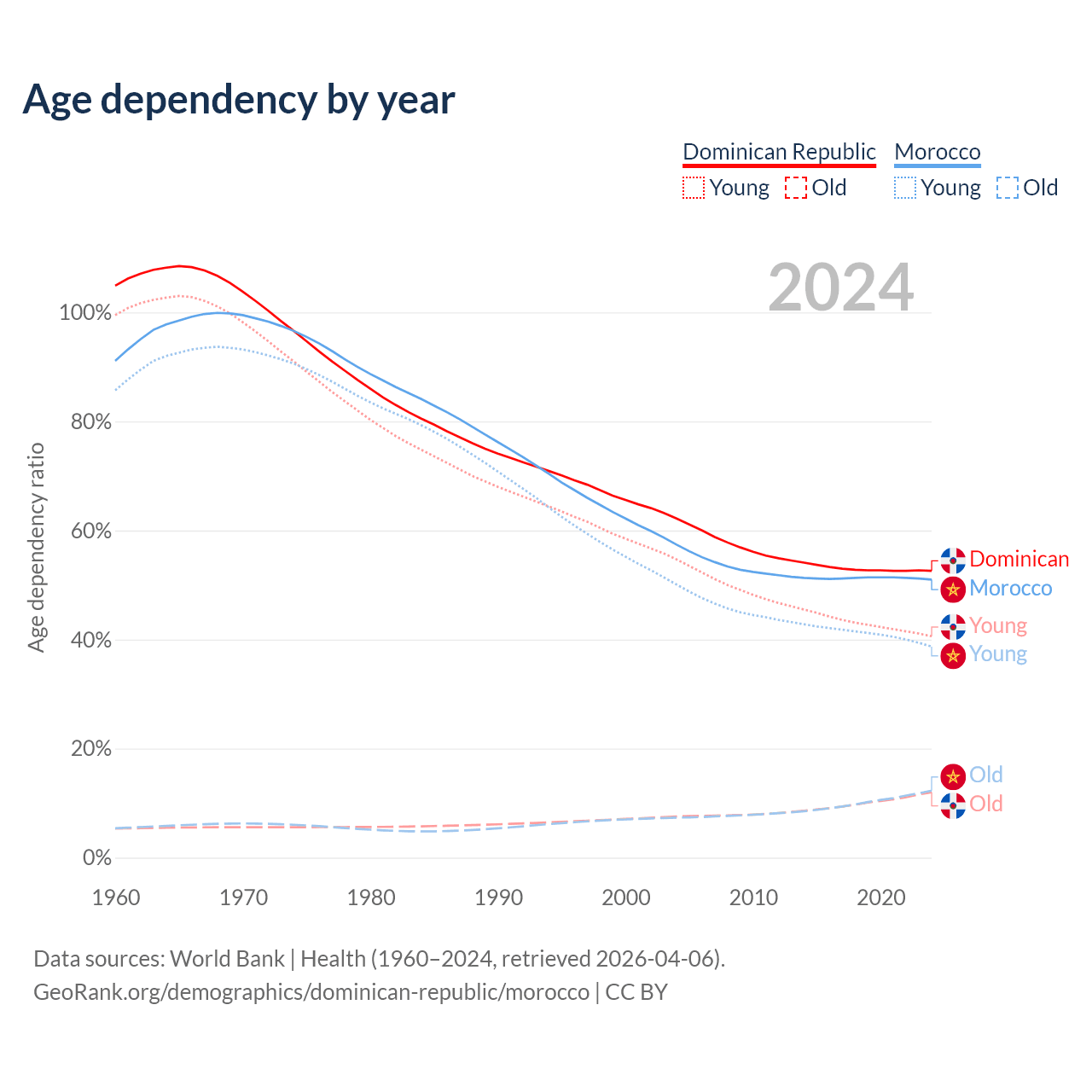 - The Dominican Republic is ranked 112/196 by median age (oldest to youngest) vs 100/196 for Morocco.
