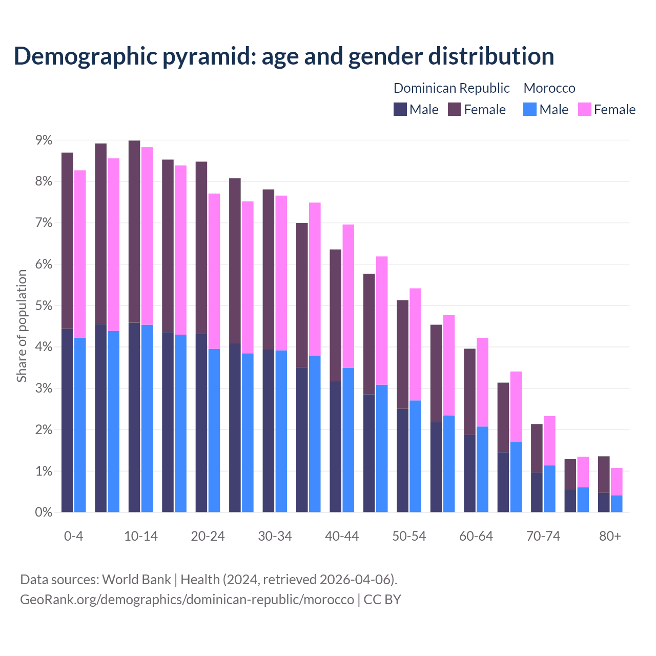 - As of 2026, the population of the Dominican Republic is 11.6M vs 38.9M in Morocco - 3.34 times difference.