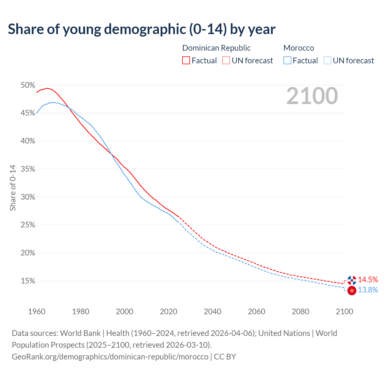- The share of young demographic (0-15 years old) in the Dominican Republic is 26.6% vs 25.6% in Morocco.